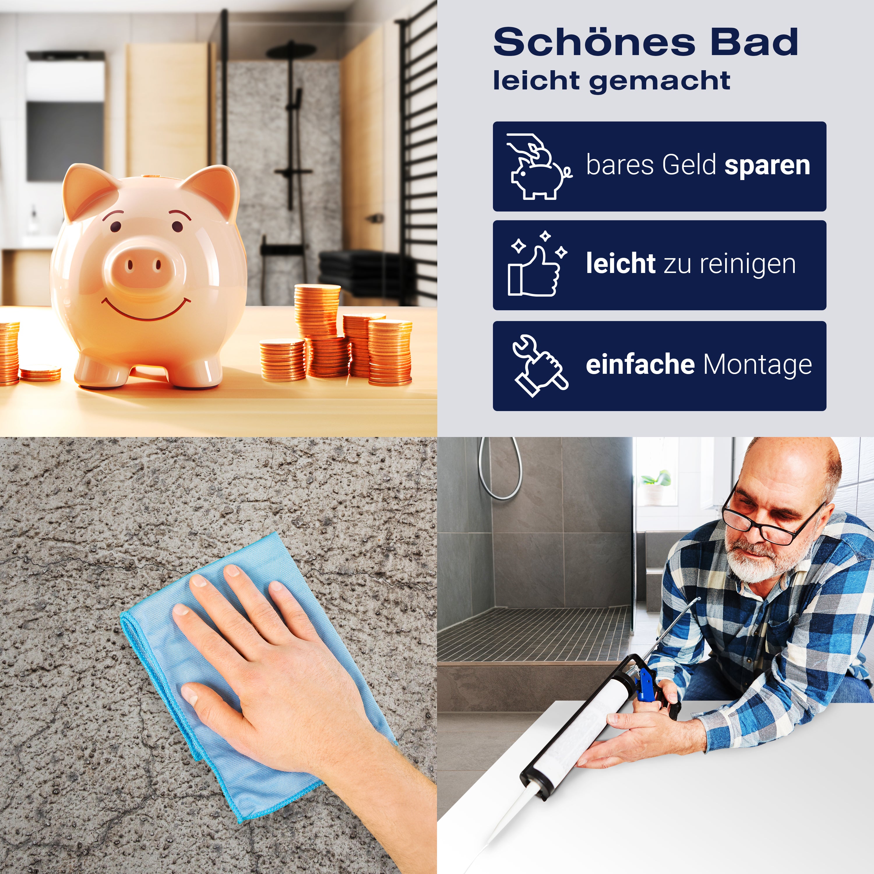 Die Reinigung Deiner Duschwand war noch nie so einfach. In einer Welt, in der Zeit ein kostbares Gut ist, verstehen wir, wie wichtig es ist, Reinigungsprozesse so effizient und mühelos wie möglich zu gestalten. Unsere Duschwände sind speziell dafür entworfen, Dein Leben leichter zu machen. Dank der glatten Oberfläche und der widerstandsfähigen Beschichtung lassen sich Spritzer und Flecken ohne großen Aufwand entfernen – ein schneller Wisch mit einem handelsüblichen Lappen, Spül- oder Wischtuch, und Deine Rückwand sieht aus wie neu.