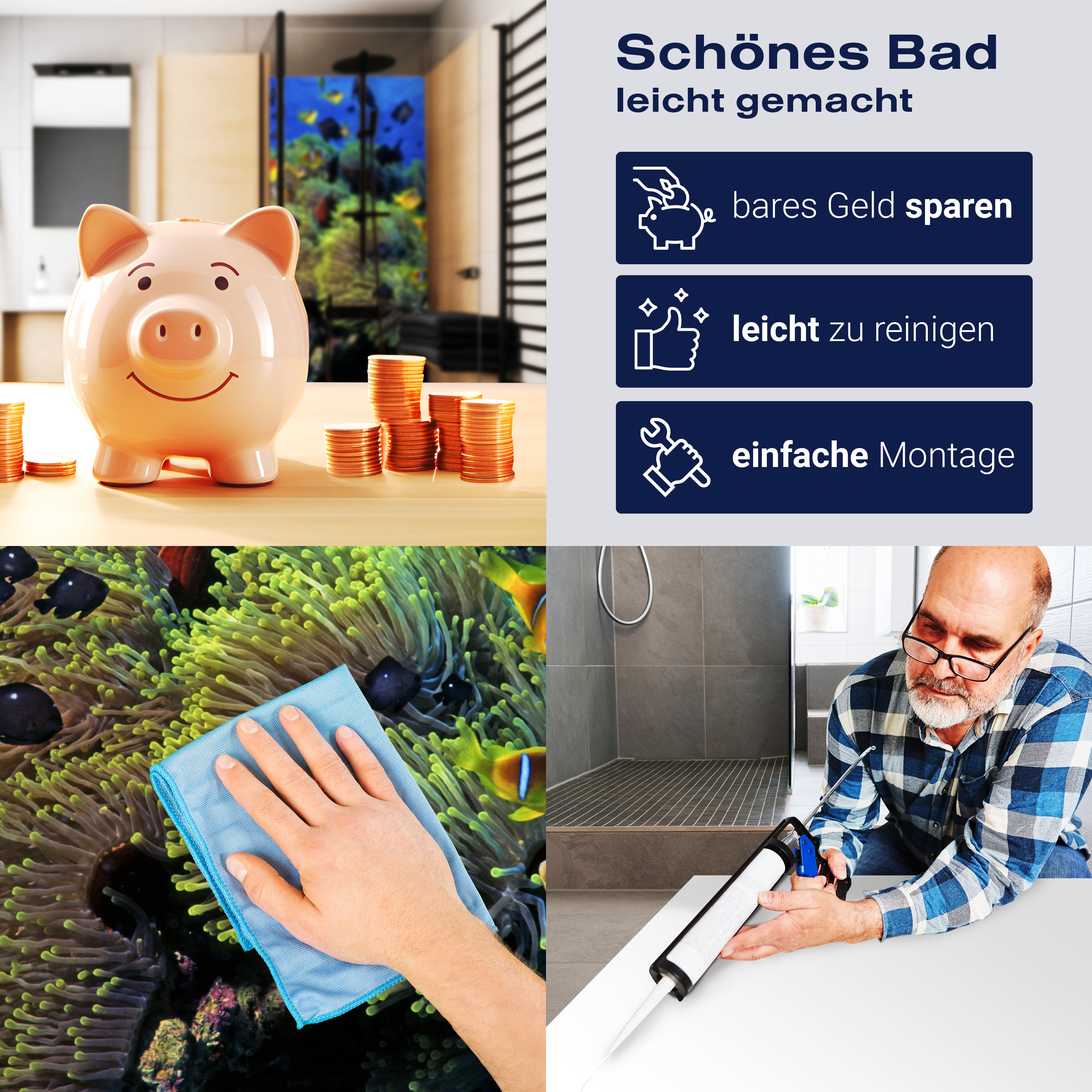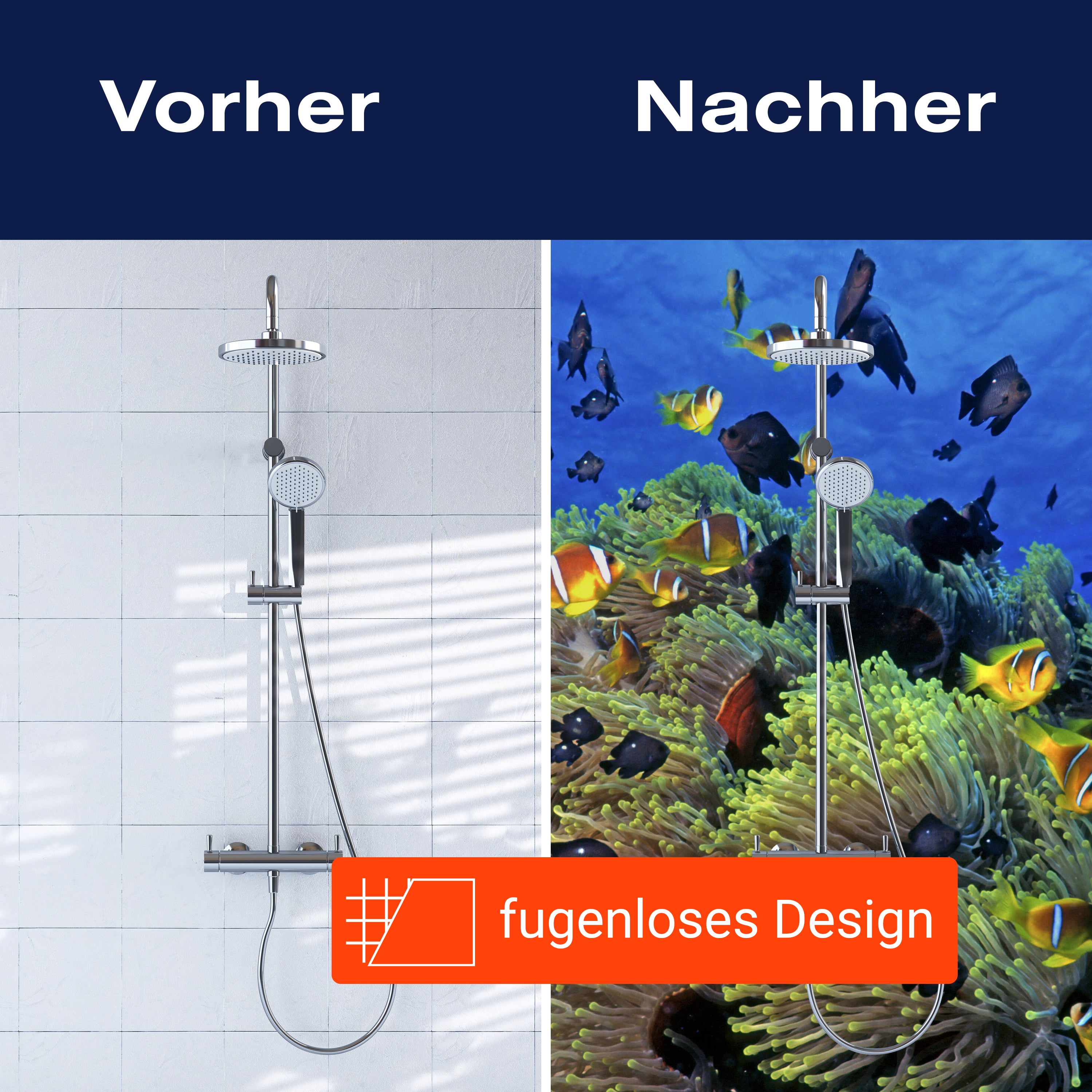 Bist du es leid, auf die langweiligen, schwer zu reinigende Fliesen in deiner Dusche zu schauen? Stell dir vor, wie dein Bad mit einer stilvollen, modernen Rückwand zum Leben erwacht! Unsere Duschwand 'Unterwasserriff' ist nicht nur ein optisches Highlight, sondern auch praktisch und pflegeleicht.