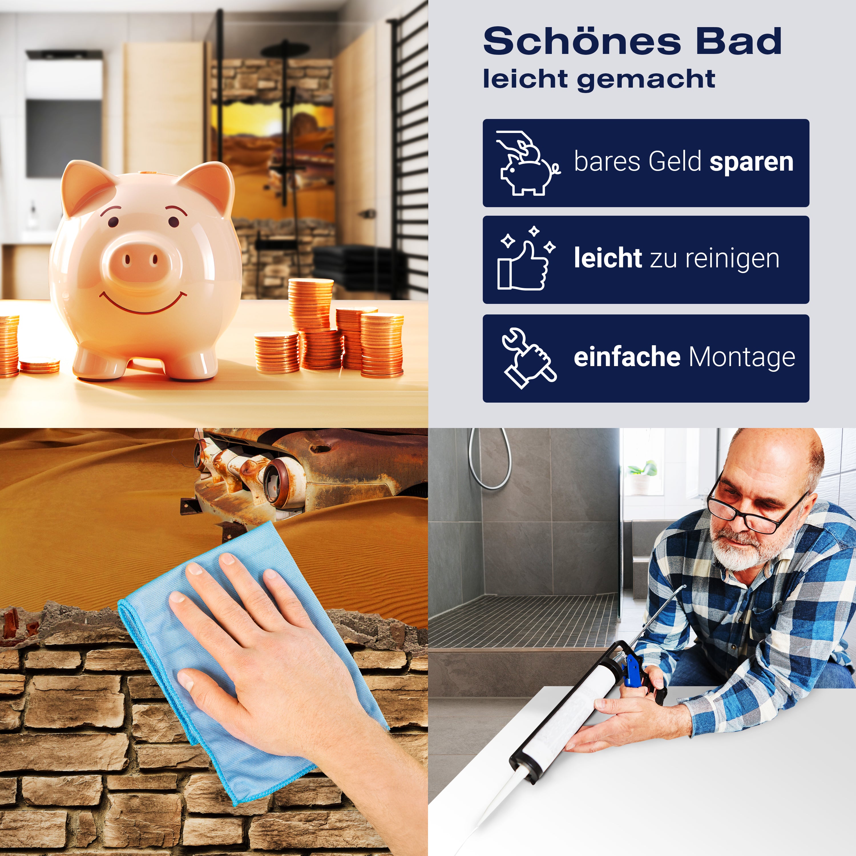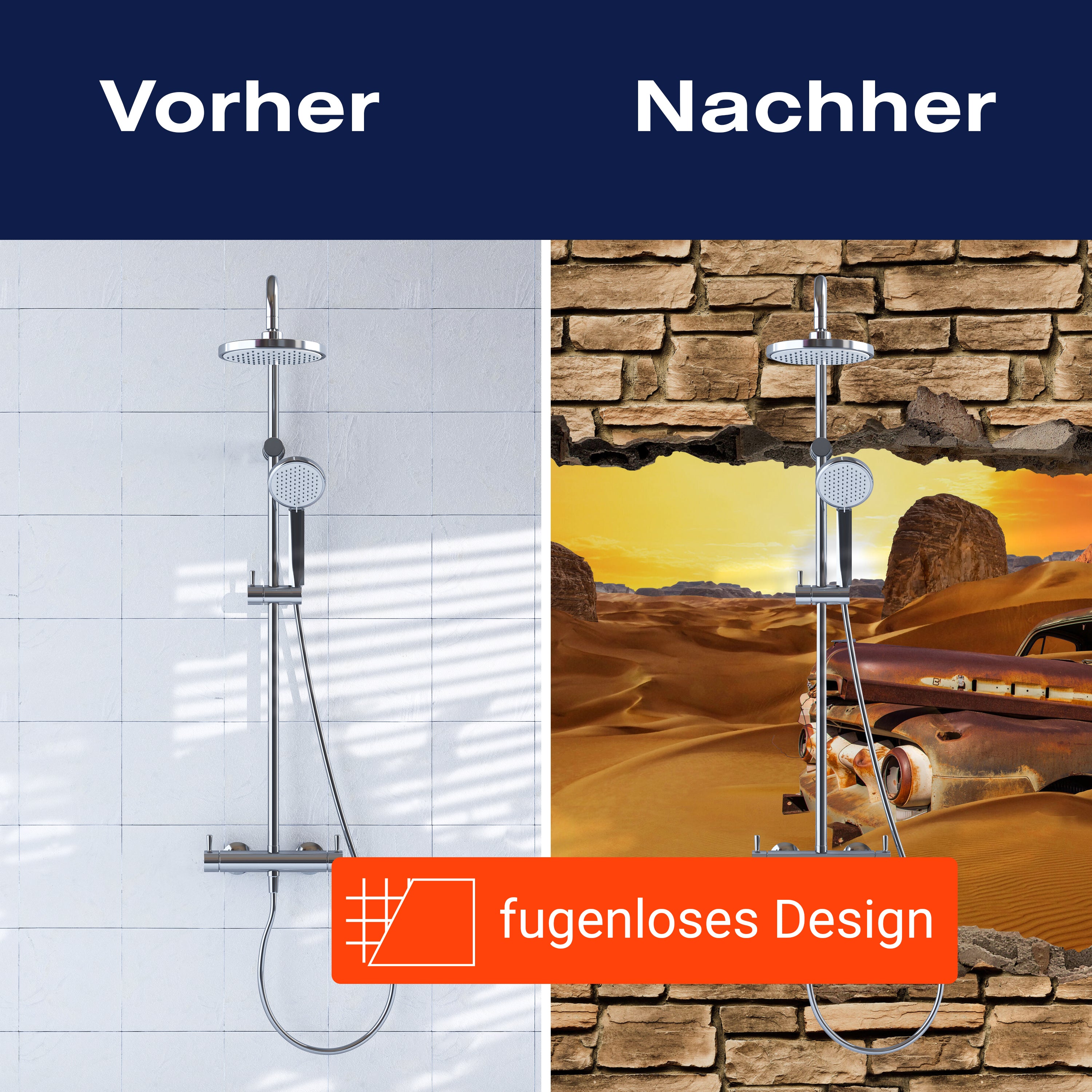 Bist du es leid, auf die langweiligen, schwer zu reinigende Fliesen in deiner Dusche zu schauen? Stell dir vor, wie dein Bad mit einer stilvollen, modernen Rückwand zum Leben erwacht! Unsere Duschwand '3D Altes Auto in der Wüste -Steinmauer' ist nicht nur ein optisches Highlight, sondern auch praktisch und pflegeleicht.