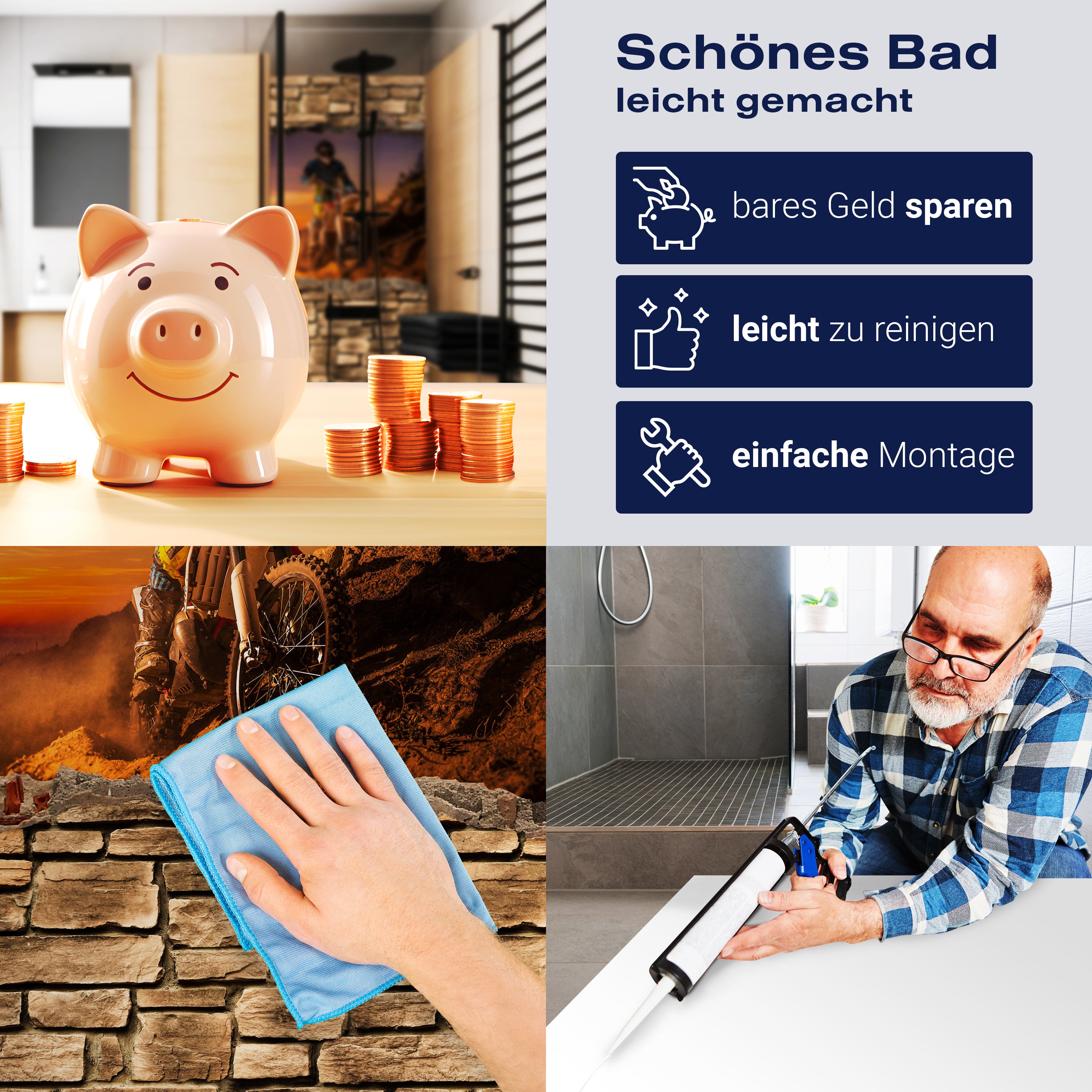 Bist du es leid, auf die langweiligen, schwer zu reinigende Fliesen in deiner Dusche zu schauen? Stell dir vor, wie dein Bad mit einer stilvollen, modernen Rückwand zum Leben erwacht! Unsere Duschwand '3D Extreme Biker- Steinmauer' ist nicht nur ein optisches Highlight, sondern auch praktisch und pflegeleicht.