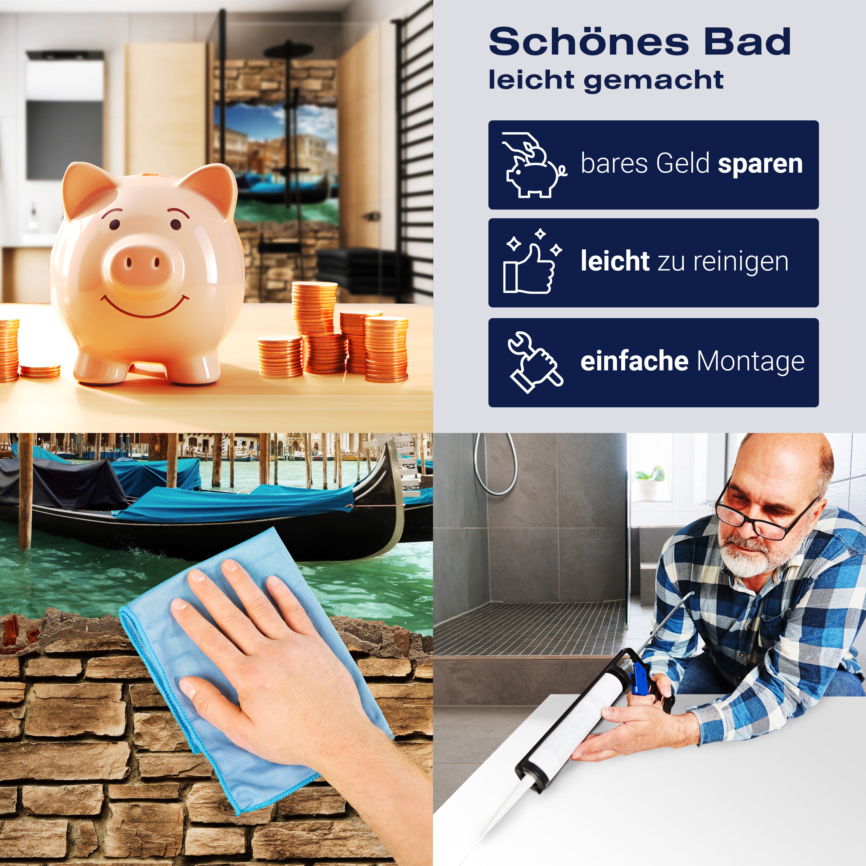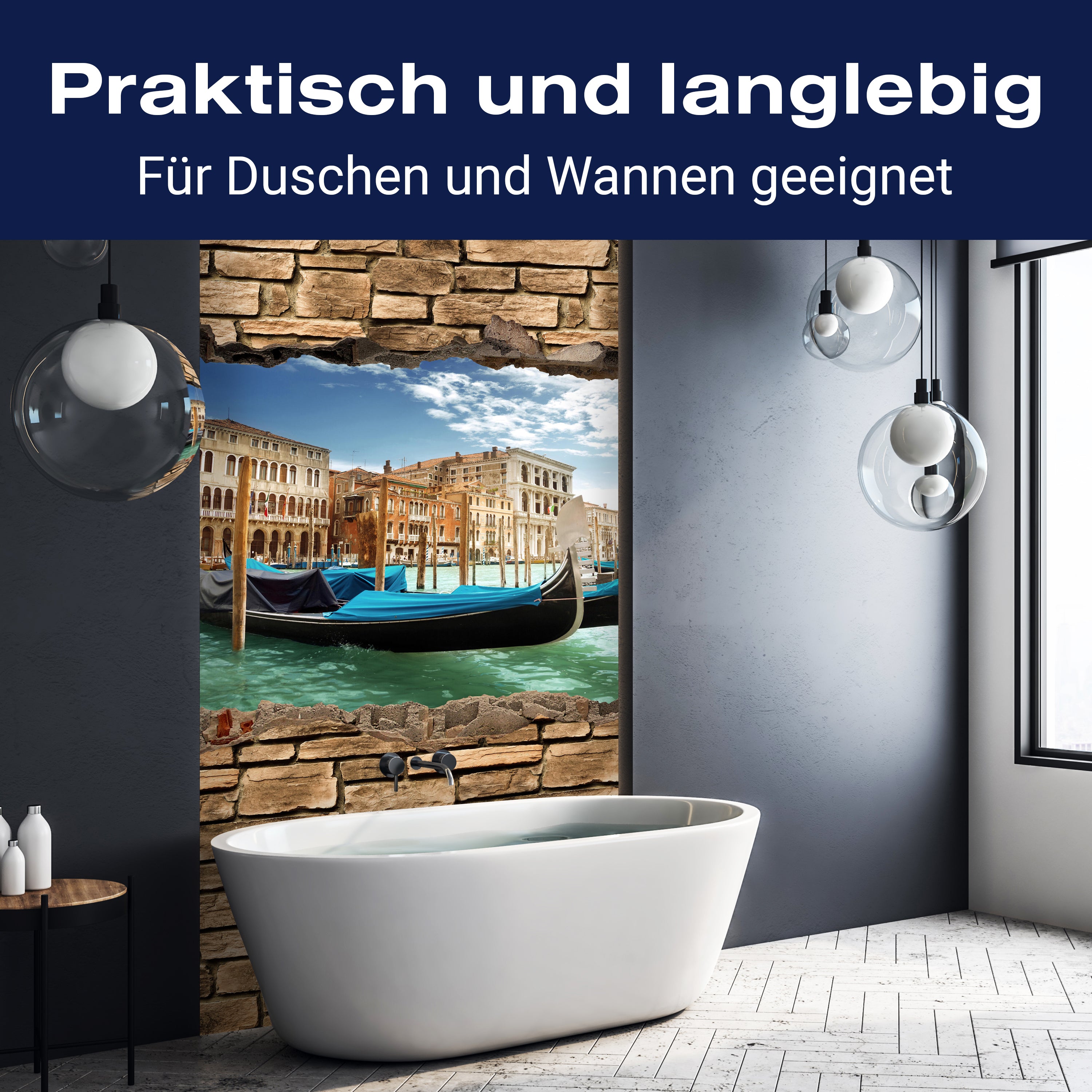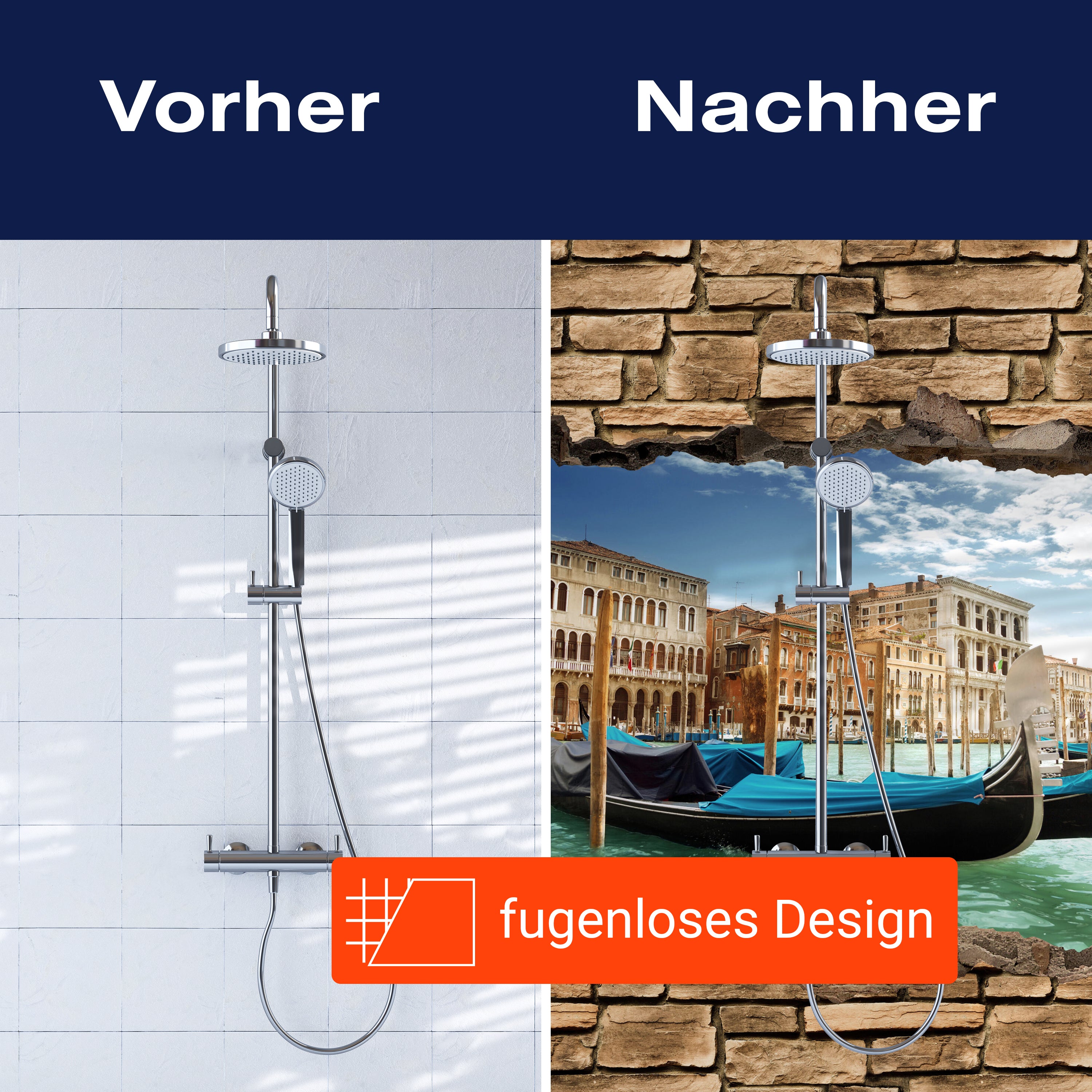 Bist du es leid, auf die langweiligen, schwer zu reinigende Fliesen in deiner Dusche zu schauen? Stell dir vor, wie dein Bad mit einer stilvollen, modernen Rückwand zum Leben erwacht! Unsere Duschwand '3D Gondeln Venedig - Steinmauer' ist nicht nur ein optisches Highlight, sondern auch praktisch und pflegeleicht.