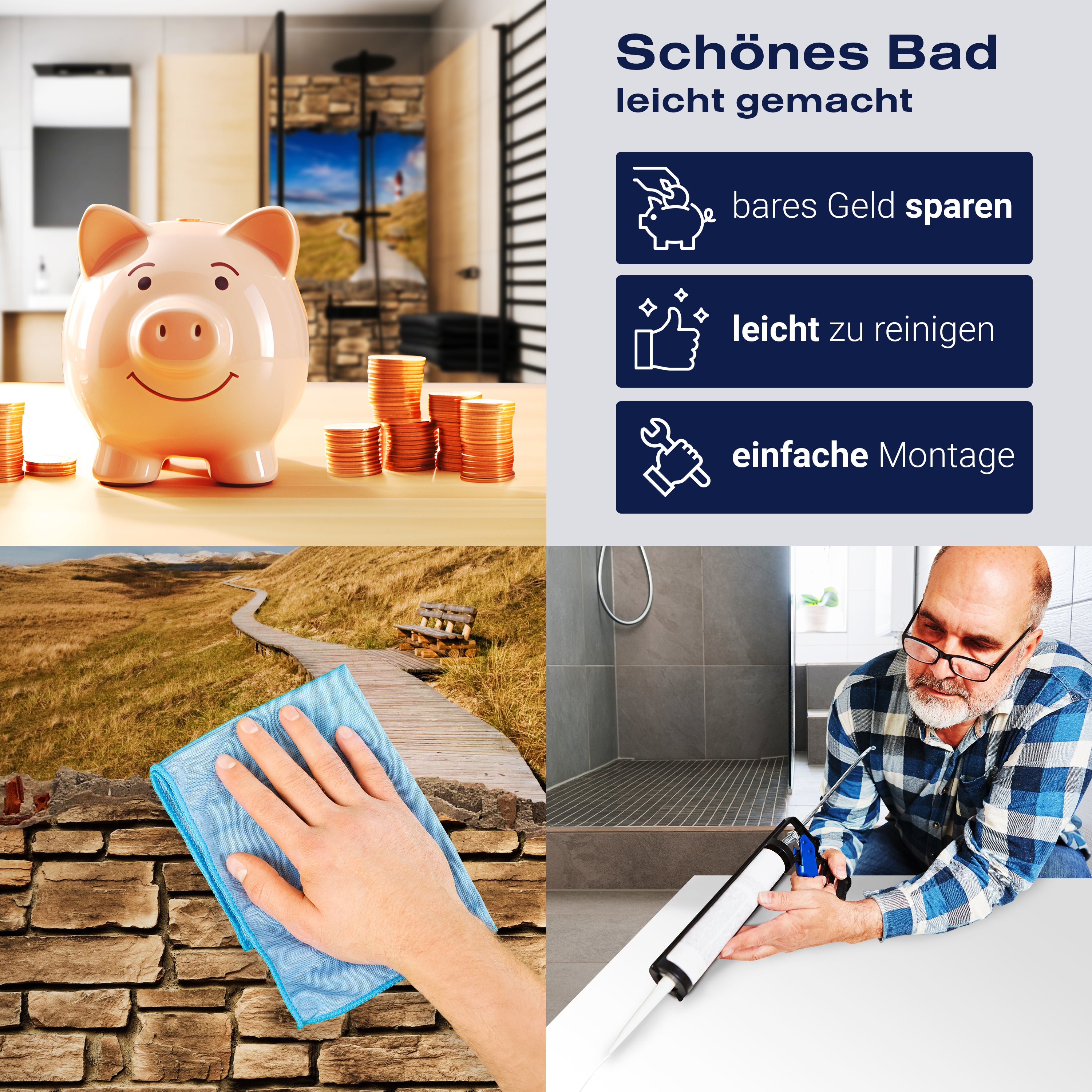 Die Reinigung Deiner Duschwand war noch nie so einfach. In einer Welt, in der Zeit ein kostbares Gut ist, verstehen wir, wie wichtig es ist, Reinigungsprozesse so effizient und mühelos wie möglich zu gestalten. Unsere Duschwände sind speziell dafür entworfen, Dein Leben leichter zu machen. Dank der glatten Oberfläche und der widerstandsfähigen Beschichtung lassen sich Spritzer und Flecken ohne großen Aufwand entfernen – ein schneller Wisch mit einem handelsüblichen Lappen, Spül- oder Wischtuch, und Deine Rückwand sieht aus wie neu.