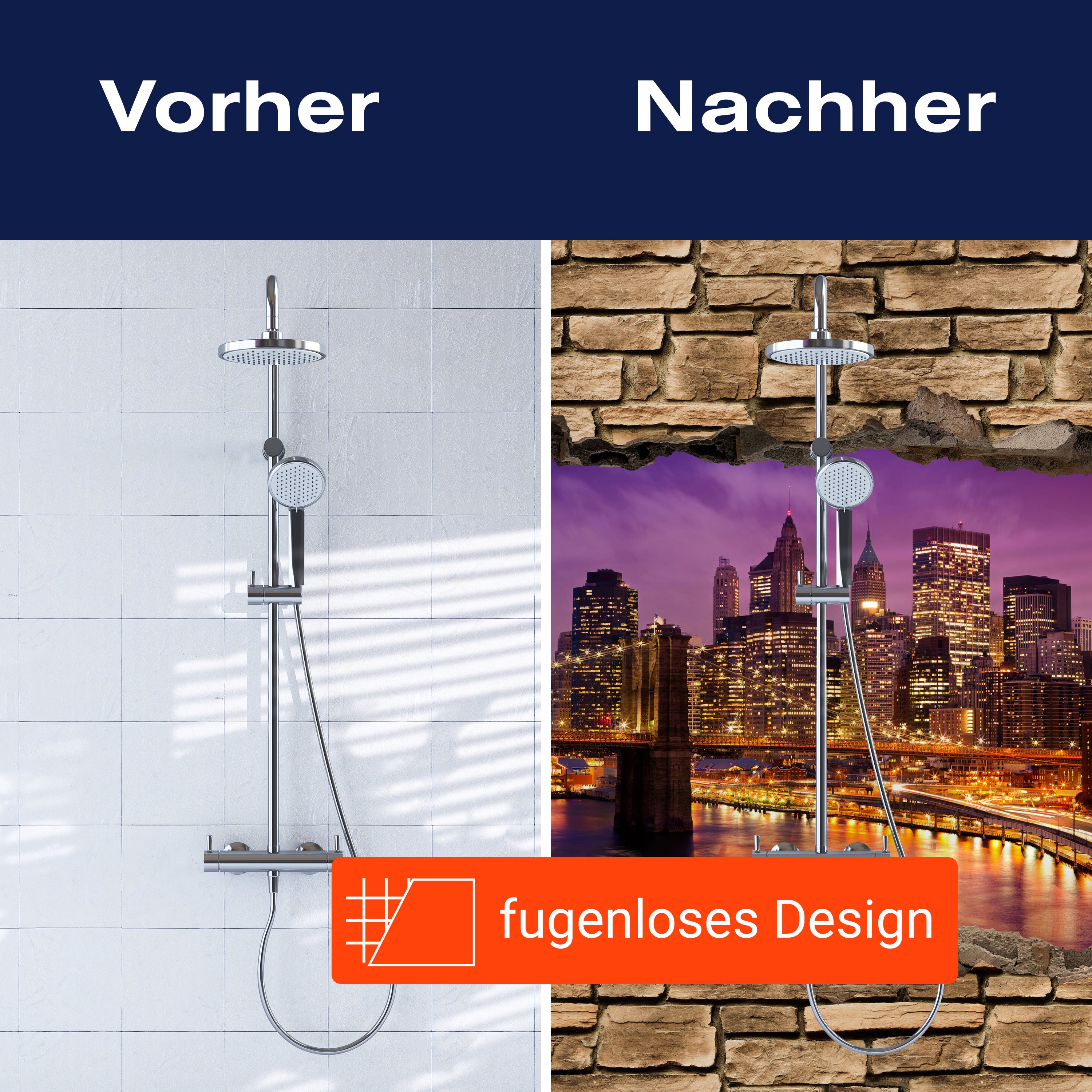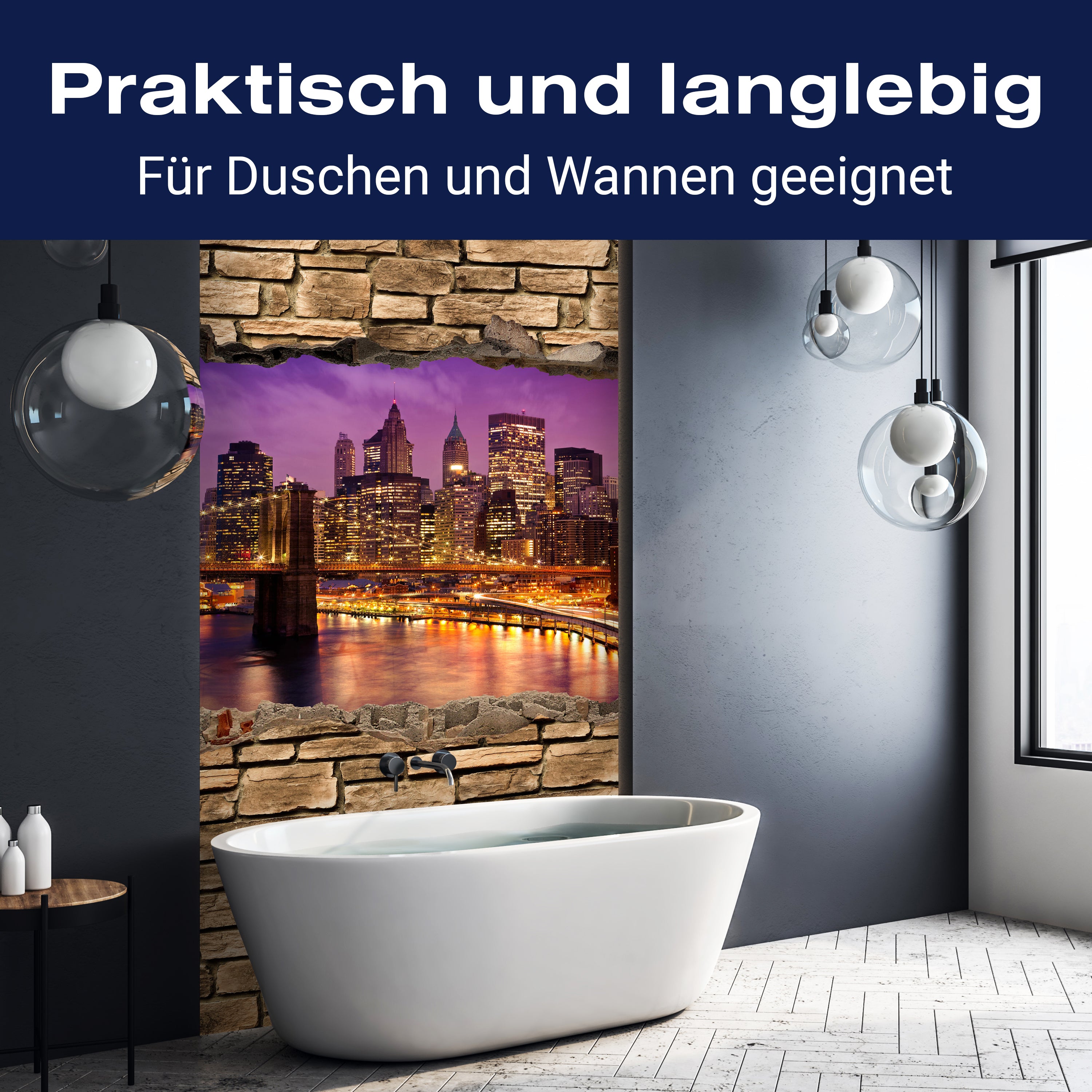 Bist du es leid, auf die langweiligen, schwer zu reinigende Fliesen in deiner Dusche zu schauen? Stell dir vor, wie dein Bad mit einer stilvollen, modernen Rückwand zum Leben erwacht! Unsere Duschwand '3D New York bei Nacht - Steinmauer' ist nicht nur ein optisches Highlight, sondern auch praktisch und pflegeleicht.