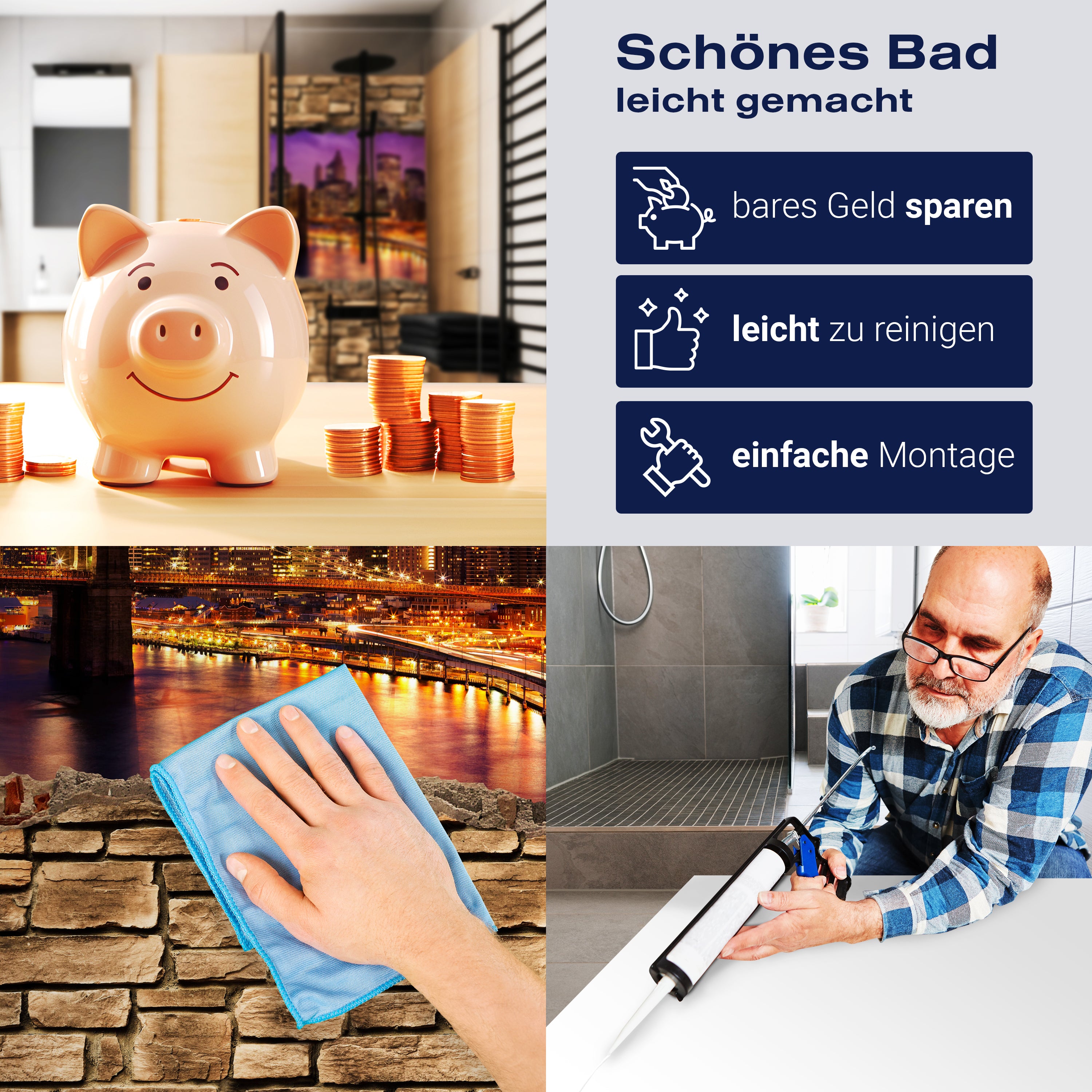 Die Reinigung Deiner Duschwand war noch nie so einfach. In einer Welt, in der Zeit ein kostbares Gut ist, verstehen wir, wie wichtig es ist, Reinigungsprozesse so effizient und mühelos wie möglich zu gestalten. Unsere Duschwände sind speziell dafür entworfen, Dein Leben leichter zu machen. Dank der glatten Oberfläche und der widerstandsfähigen Beschichtung lassen sich Spritzer und Flecken ohne großen Aufwand entfernen – ein schneller Wisch mit einem handelsüblichen Lappen, Spül- oder Wischtuch, und Deine Rückwand sieht aus wie neu.