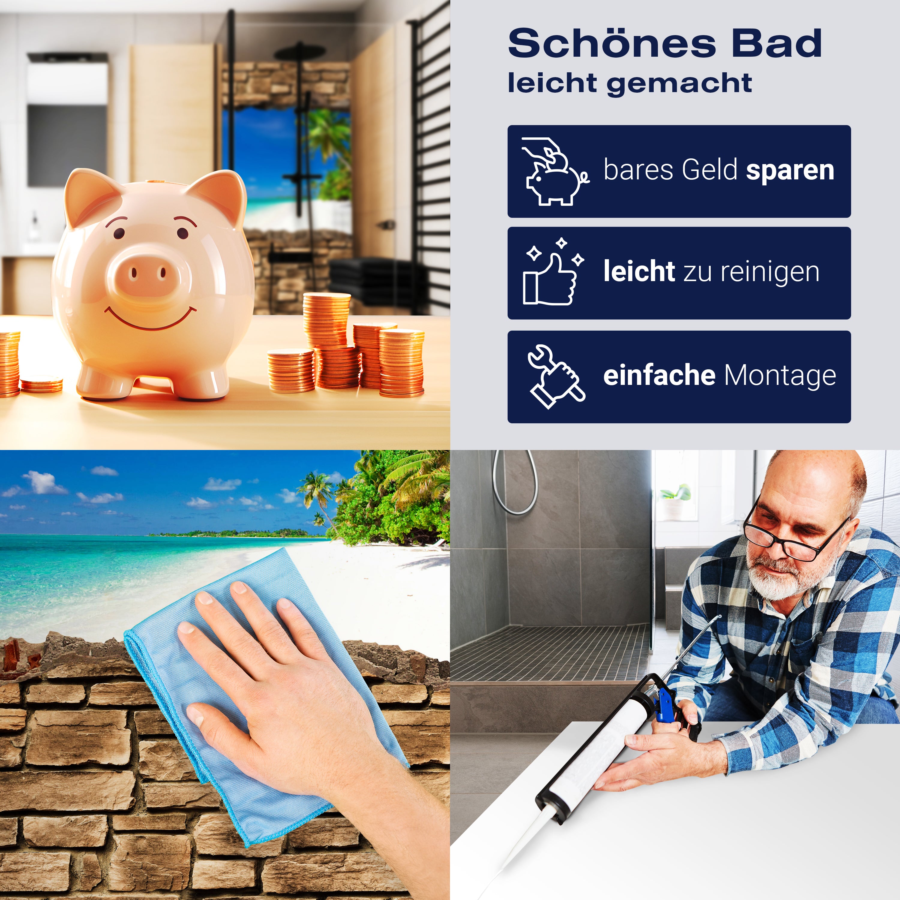 Vergiss die Tage, an denen Spritzer und Flecken deine Dusche ruiniert haben. Mit der Duschrückwand '3D Südsee - Steinmauer' gehören solche Sorgen der Vergangenheit an. Das hochwertige Material sorgt dafür, dass deine Dusche gegen Wasser und andere alltägliche Missgeschicke resistent ist. Ein einfacher Wisch, und sie sieht aus wie neu – ohne den Einsatz von aggressiven Reinigungsmitteln.