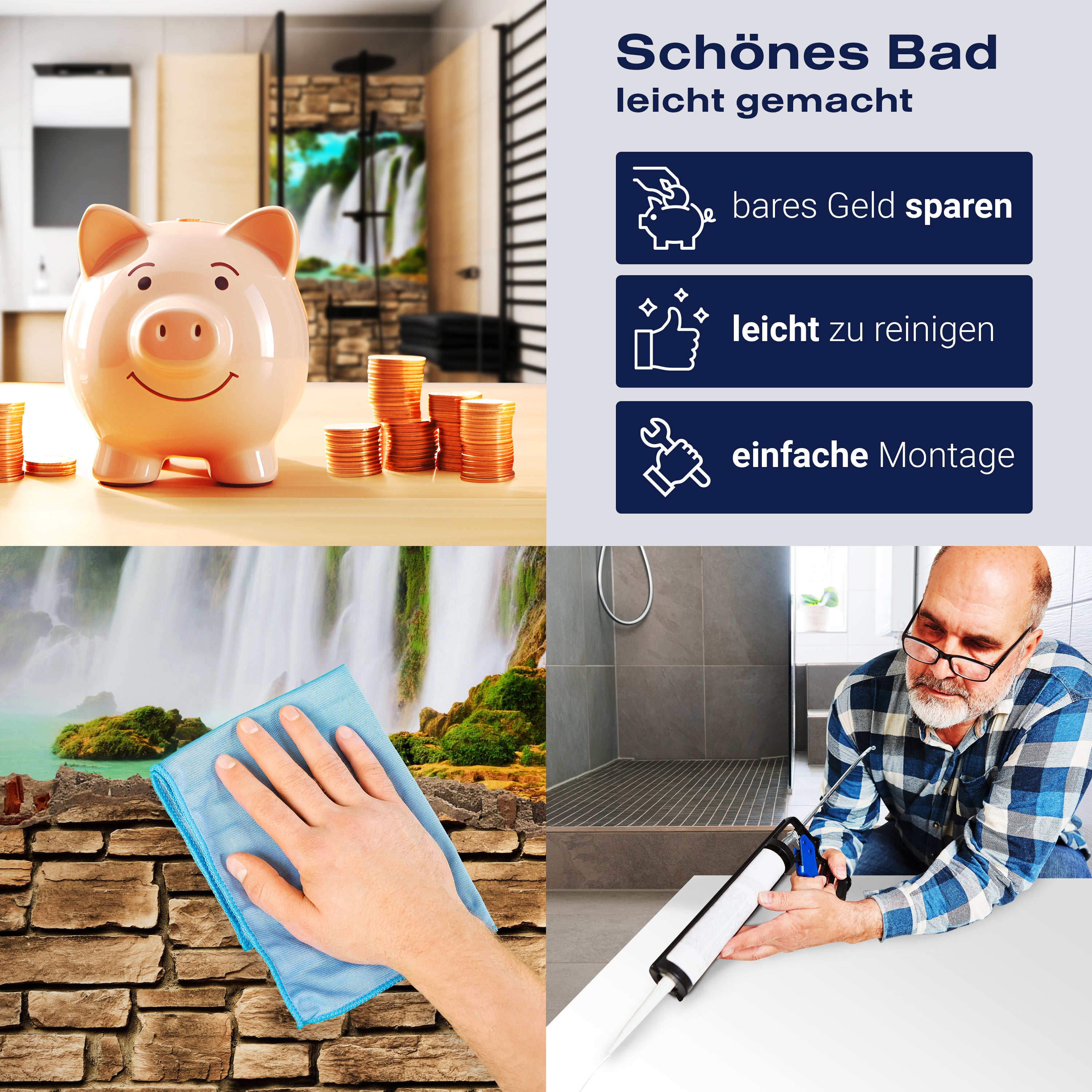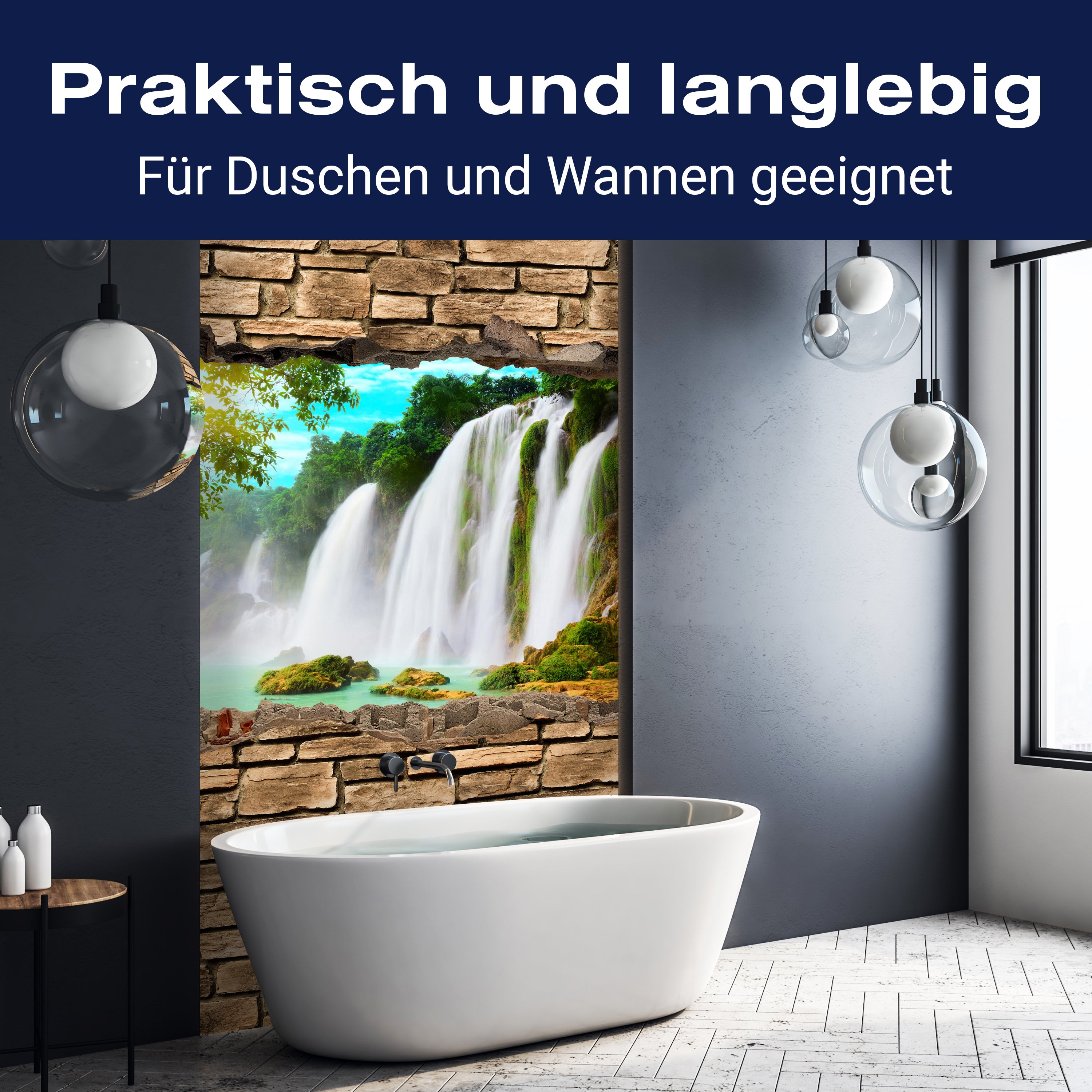 Bist du es leid, auf die langweiligen, schwer zu reinigende Fliesen in deiner Dusche zu schauen? Stell dir vor, wie dein Bad mit einer stilvollen, modernen Rückwand zum Leben erwacht! Unsere Duschwand '3D Wasserfall - Steinmauer' ist nicht nur ein optisches Highlight, sondern auch praktisch und pflegeleicht.