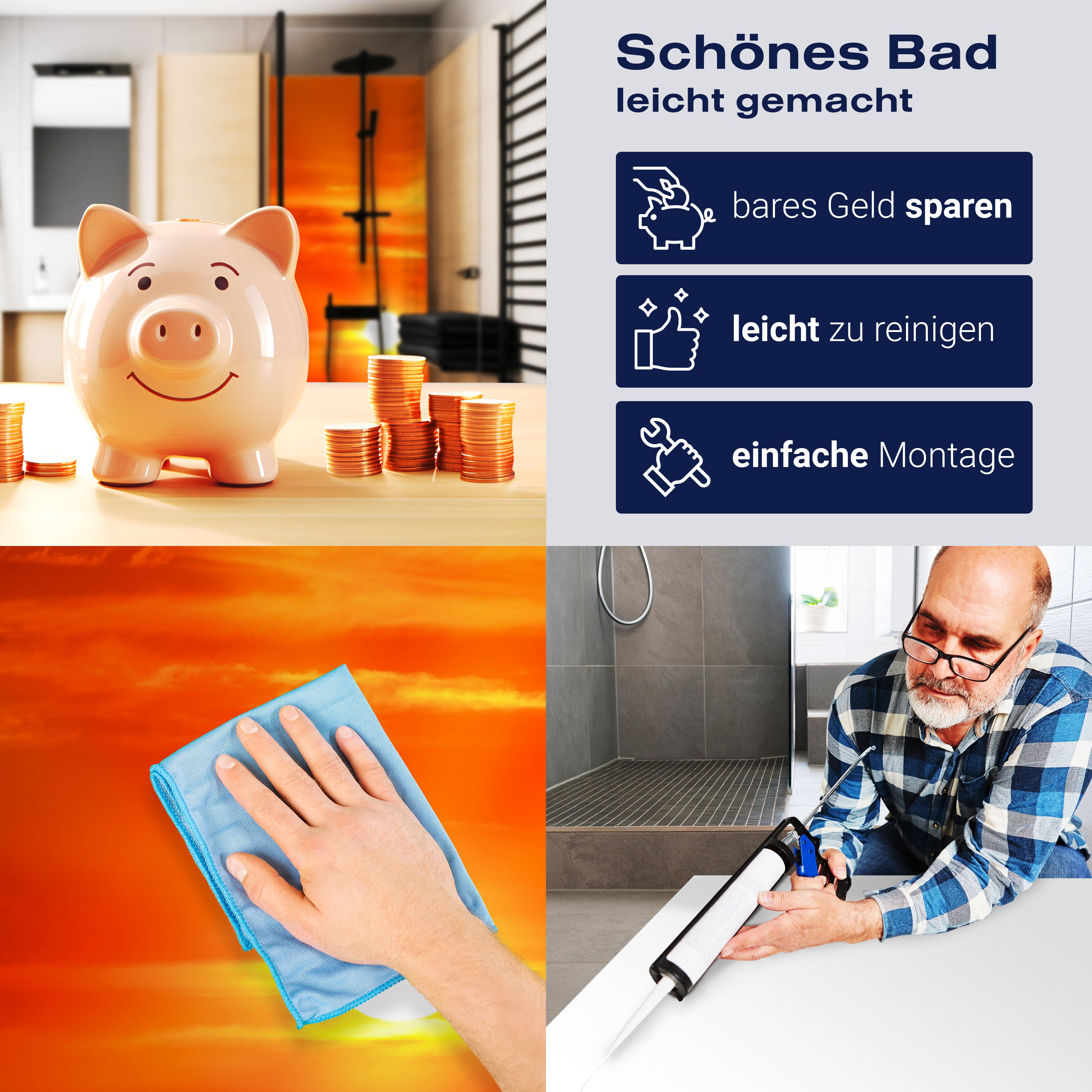 Die Reinigung Deiner Duschwand war noch nie so einfach. In einer Welt, in der Zeit ein kostbares Gut ist, verstehen wir, wie wichtig es ist, Reinigungsprozesse so effizient und mühelos wie möglich zu gestalten. Unsere Duschwände sind speziell dafür entworfen, Dein Leben leichter zu machen. Dank der glatten Oberfläche und der widerstandsfähigen Beschichtung lassen sich Spritzer und Flecken ohne großen Aufwand entfernen – ein schneller Wisch mit einem handelsüblichen Lappen, Spül- oder Wischtuch, und Deine Rückwand sieht aus wie neu.