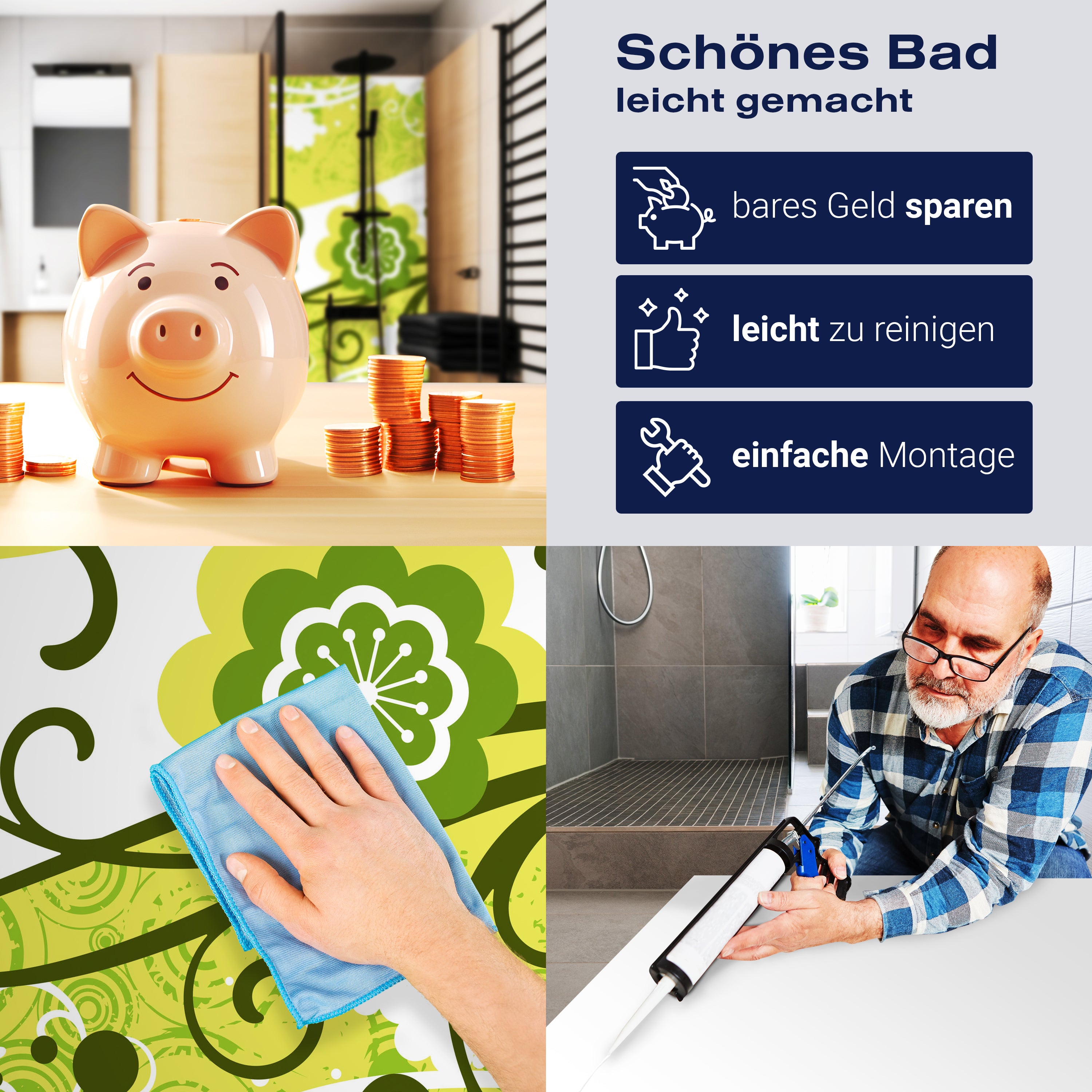 Die Reinigung Deiner Duschwand war noch nie so einfach. In einer Welt, in der Zeit ein kostbares Gut ist, verstehen wir, wie wichtig es ist, Reinigungsprozesse so effizient und mühelos wie möglich zu gestalten. Unsere Duschwände sind speziell dafür entworfen, Dein Leben leichter zu machen. Dank der glatten Oberfläche und der widerstandsfähigen Beschichtung lassen sich Spritzer und Flecken ohne großen Aufwand entfernen – ein schneller Wisch mit einem handelsüblichen Lappen, Spül- oder Wischtuch, und Deine Rückwand sieht aus wie neu.