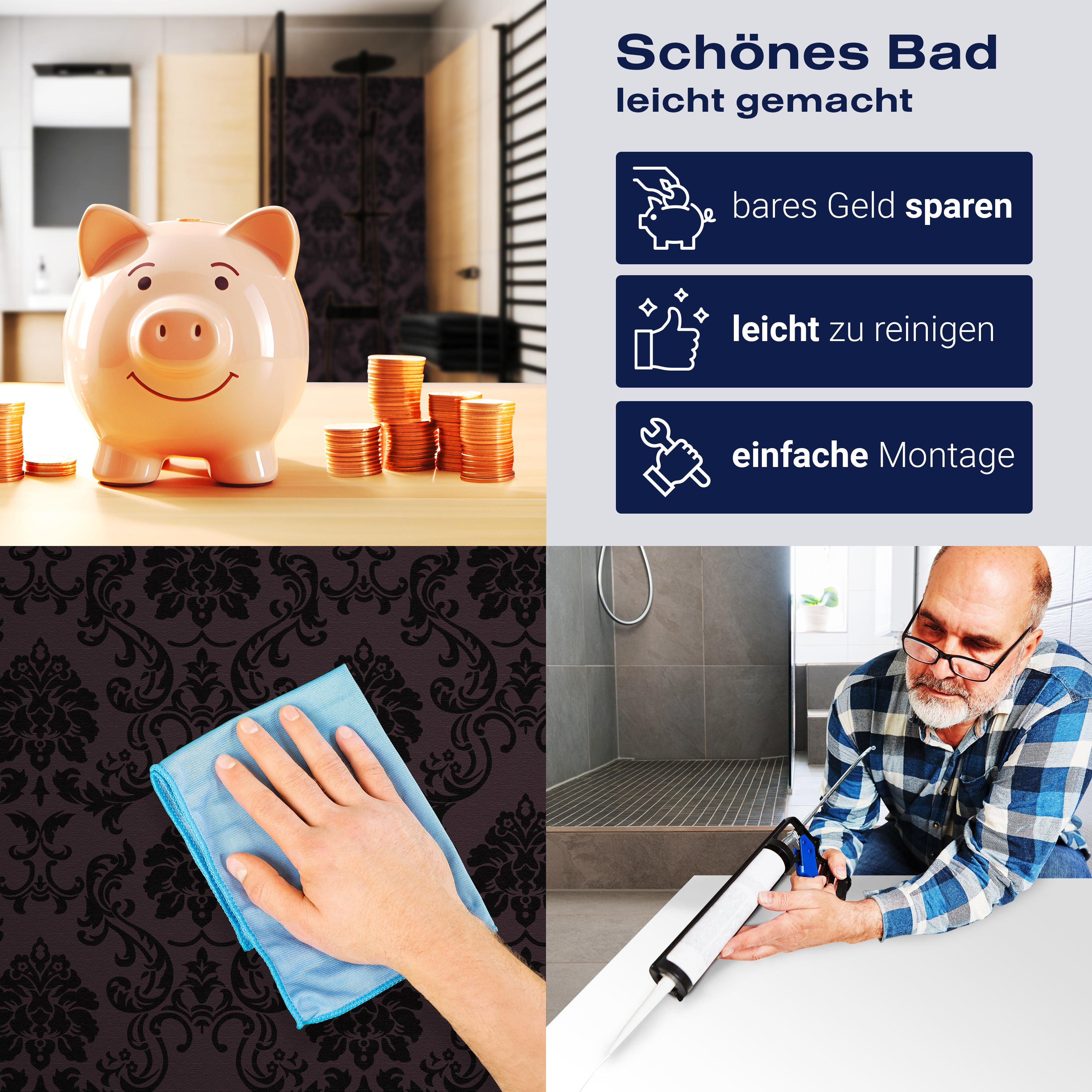 Die Reinigung Deiner Duschwand war noch nie so einfach. In einer Welt, in der Zeit ein kostbares Gut ist, verstehen wir, wie wichtig es ist, Reinigungsprozesse so effizient und mühelos wie möglich zu gestalten. Unsere Duschwände sind speziell dafür entworfen, Dein Leben leichter zu machen. Dank der glatten Oberfläche und der widerstandsfähigen Beschichtung lassen sich Spritzer und Flecken ohne großen Aufwand entfernen – ein schneller Wisch mit einem handelsüblichen Lappen, Spül- oder Wischtuch, und Deine Rückwand sieht aus wie neu.