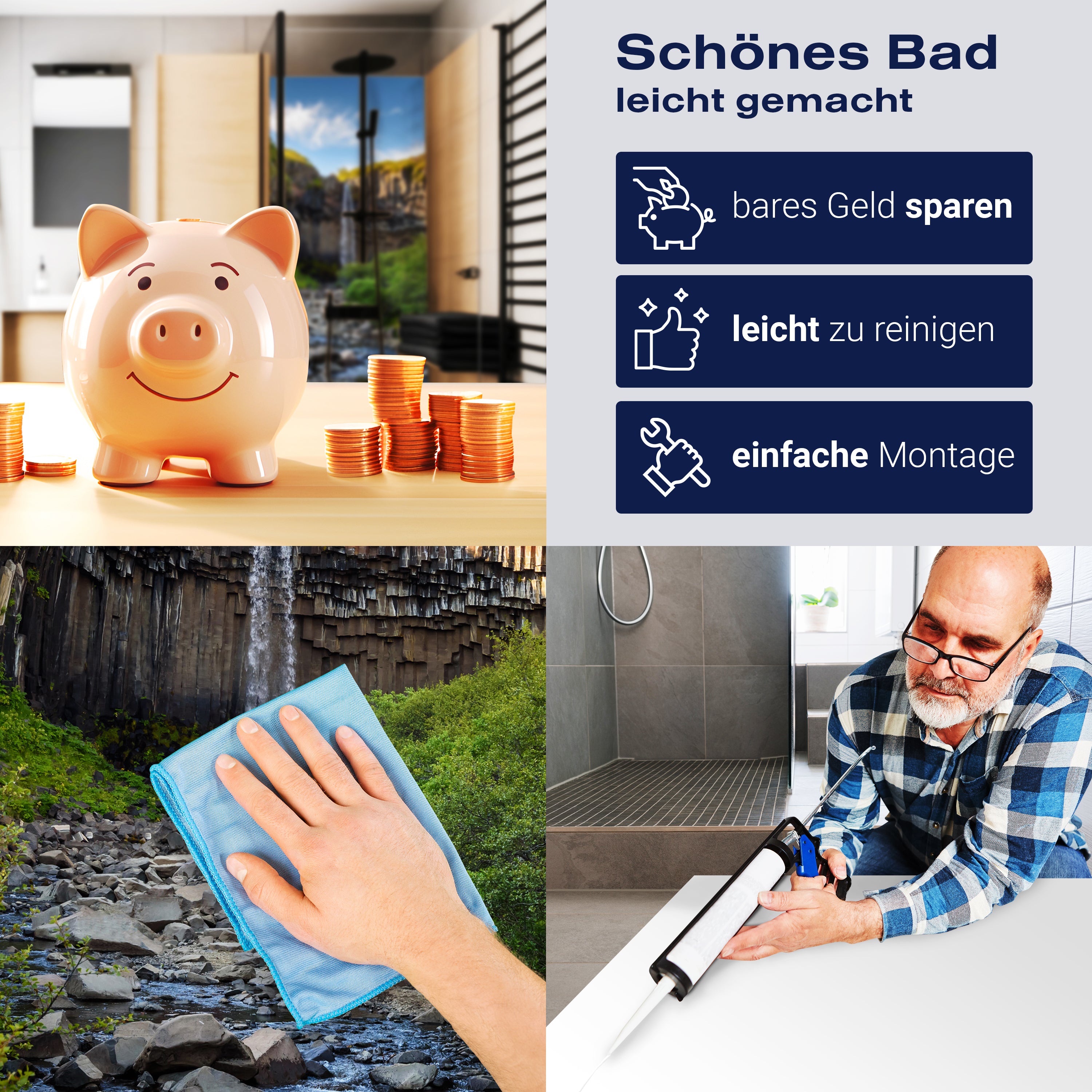 Bist du es leid, auf die langweiligen, schwer zu reinigende Fliesen in deiner Dusche zu schauen? Stell dir vor, wie dein Bad mit einer stilvollen, modernen Rückwand zum Leben erwacht! Unsere Duschwand 'Basaltsäulenwasserfall Island' ist nicht nur ein optisches Highlight, sondern auch praktisch und pflegeleicht.