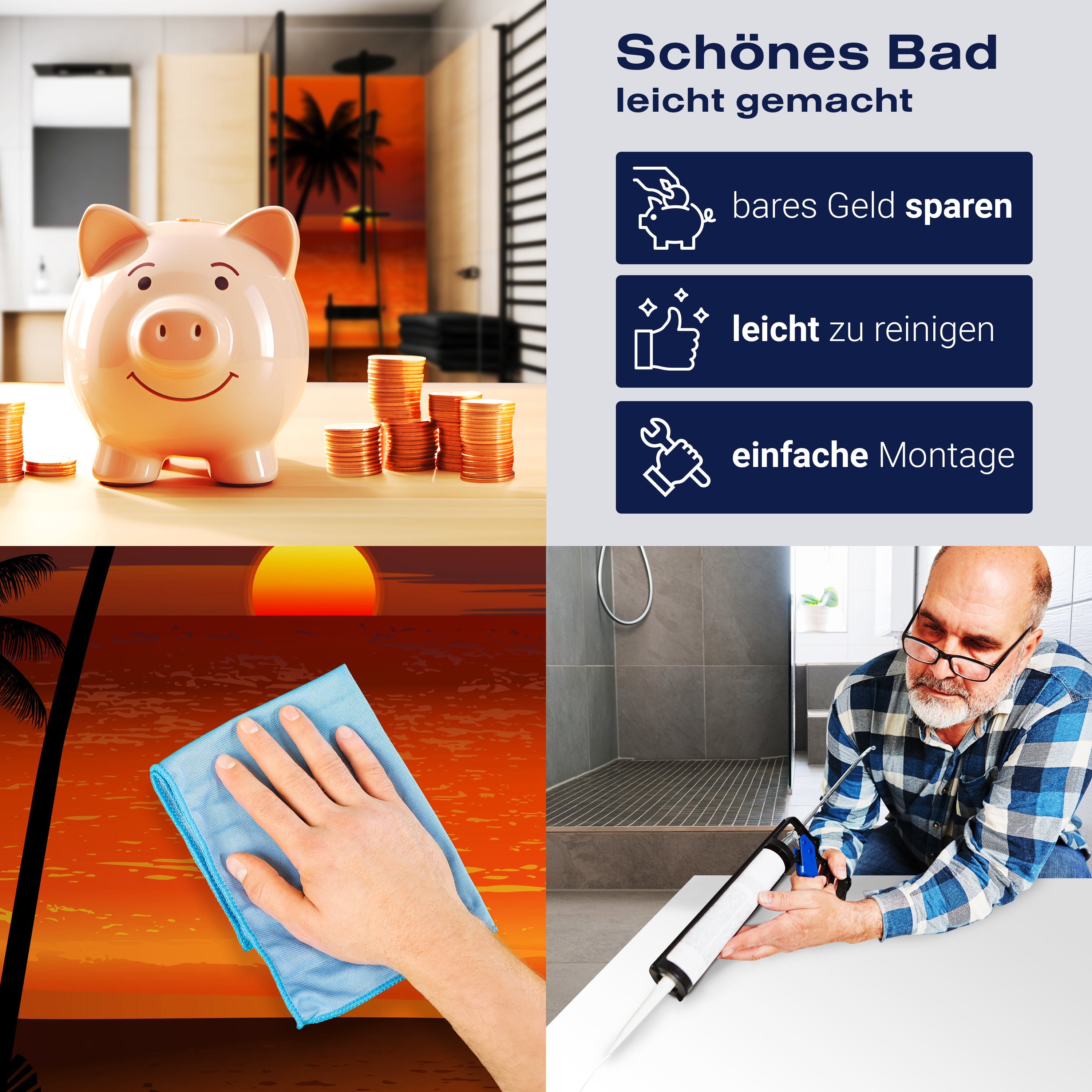Die Reinigung Deiner Duschwand war noch nie so einfach. In einer Welt, in der Zeit ein kostbares Gut ist, verstehen wir, wie wichtig es ist, Reinigungsprozesse so effizient und mühelos wie möglich zu gestalten. Unsere Duschwände sind speziell dafür entworfen, Dein Leben leichter zu machen. Dank der glatten Oberfläche und der widerstandsfähigen Beschichtung lassen sich Spritzer und Flecken ohne großen Aufwand entfernen – ein schneller Wisch mit einem handelsüblichen Lappen, Spül- oder Wischtuch, und Deine Rückwand sieht aus wie neu.
