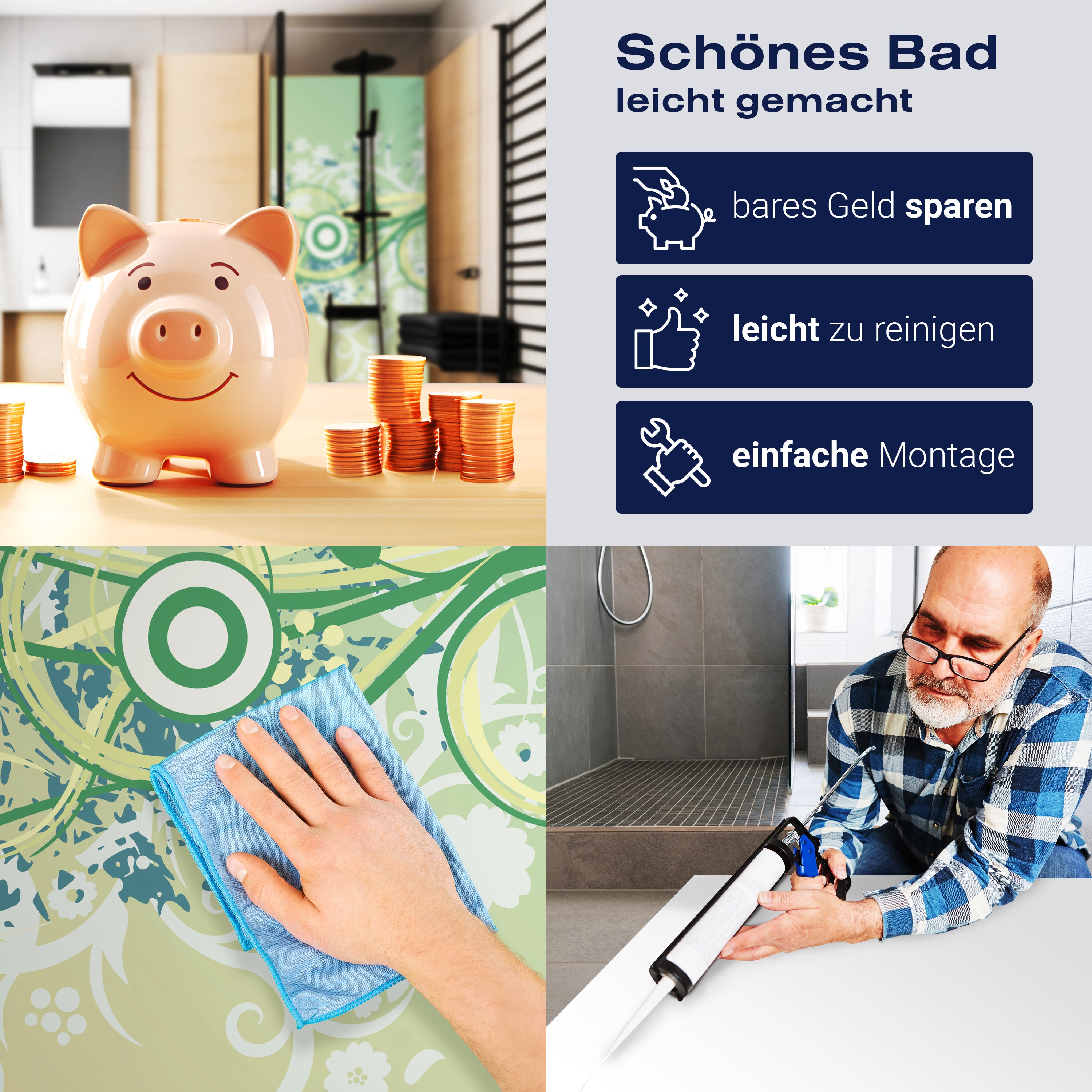 Die Reinigung Deiner Duschwand war noch nie so einfach. In einer Welt, in der Zeit ein kostbares Gut ist, verstehen wir, wie wichtig es ist, Reinigungsprozesse so effizient und mühelos wie möglich zu gestalten. Unsere Duschwände sind speziell dafür entworfen, Dein Leben leichter zu machen. Dank der glatten Oberfläche und der widerstandsfähigen Beschichtung lassen sich Spritzer und Flecken ohne großen Aufwand entfernen – ein schneller Wisch mit einem handelsüblichen Lappen, Spül- oder Wischtuch, und Deine Rückwand sieht aus wie neu.