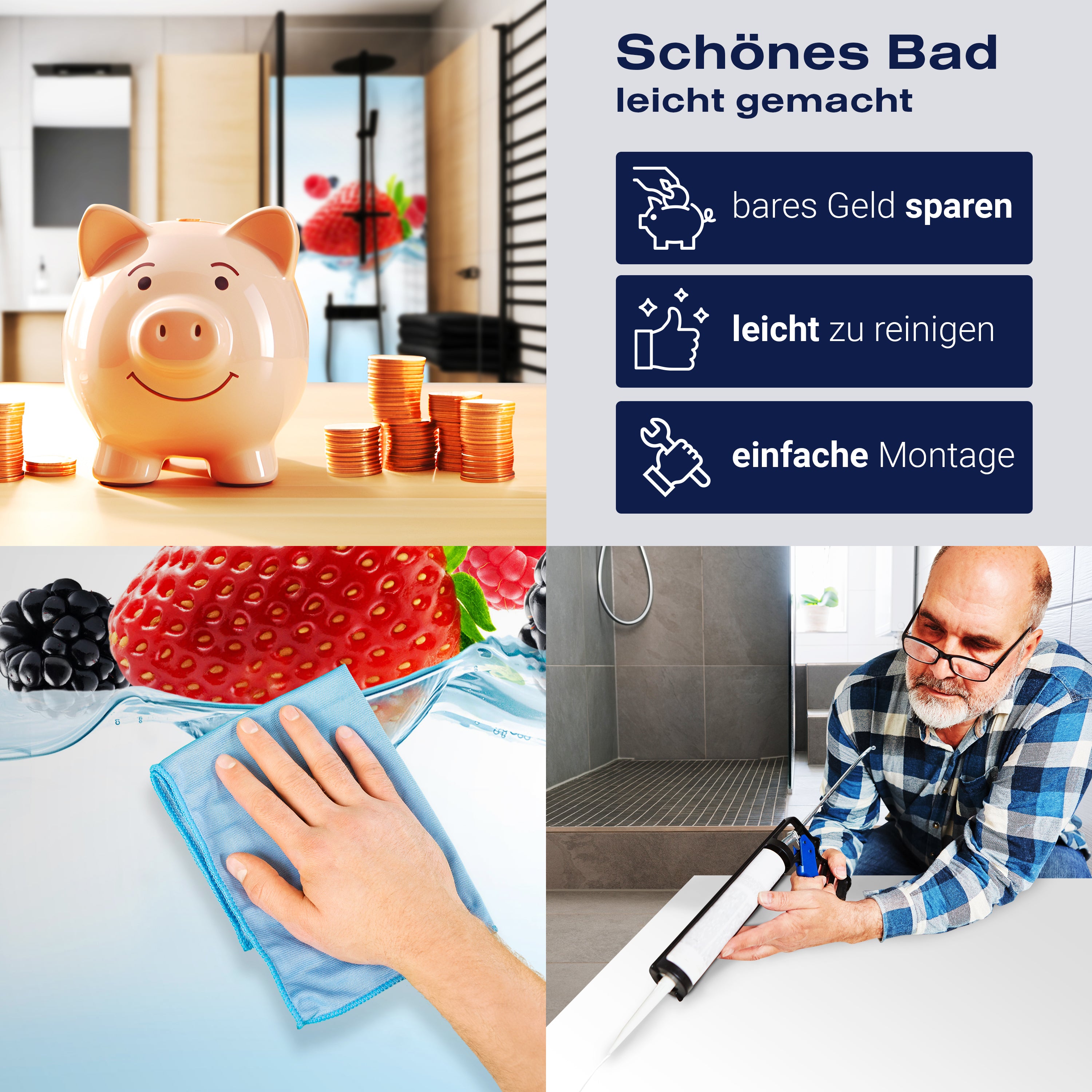 Bist du es leid, auf die langweiligen, schwer zu reinigende Fliesen in deiner Dusche zu schauen? Stell dir vor, wie dein Bad mit einer stilvollen, modernen Rückwand zum Leben erwacht! Unsere Duschwand 'Close up Blick frische Beeren' ist nicht nur ein optisches Highlight, sondern auch praktisch und pflegeleicht.
