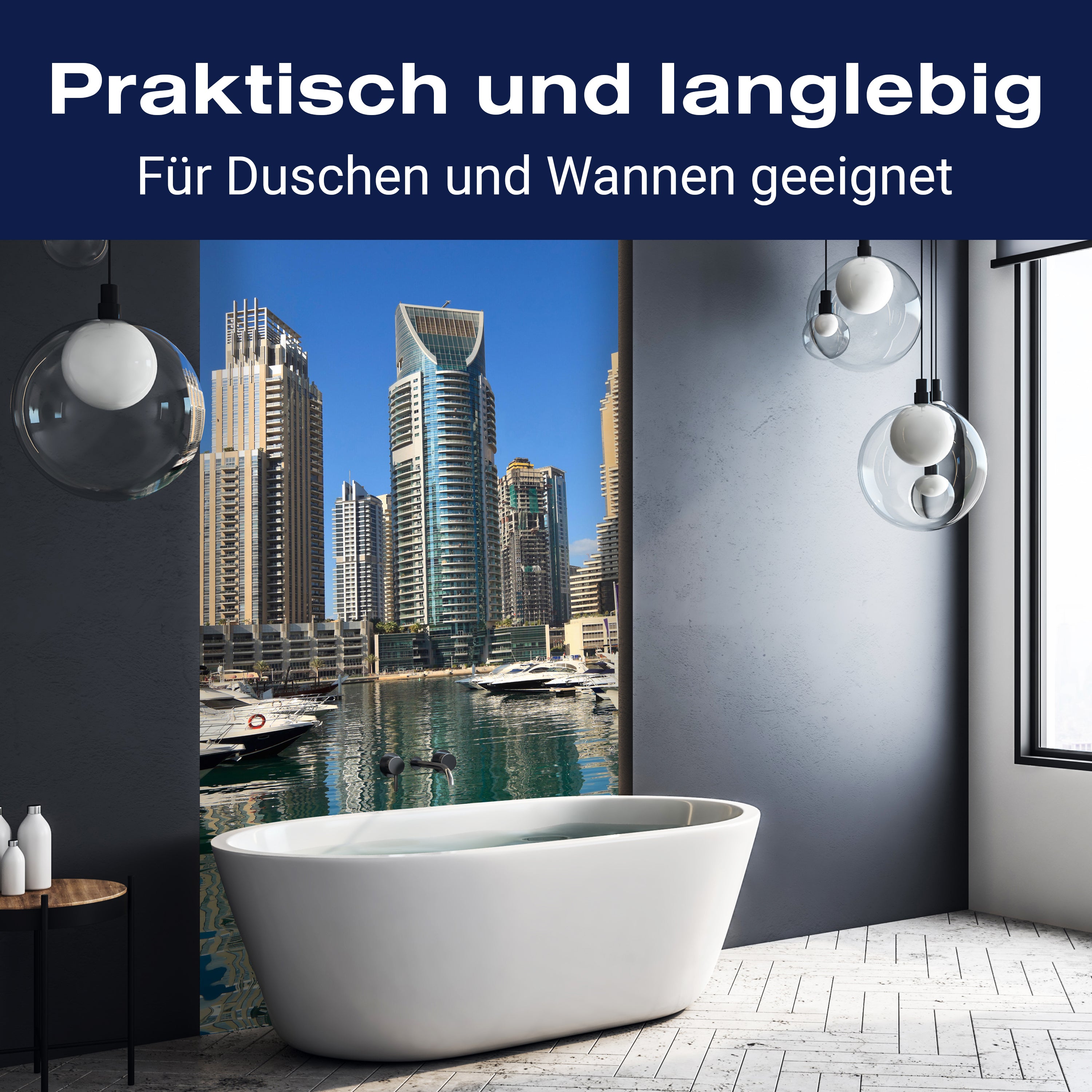 Vergiss die Tage, an denen Spritzer und Flecken deine Dusche ruiniert haben. Mit der Duschrückwand 'Dubai Skyline' gehören solche Sorgen der Vergangenheit an. Das hochwertige Material sorgt dafür, dass deine Dusche gegen Wasser und andere alltägliche Missgeschicke resistent ist. Ein einfacher Wisch, und sie sieht aus wie neu – ohne den Einsatz von aggressiven Reinigungsmitteln.