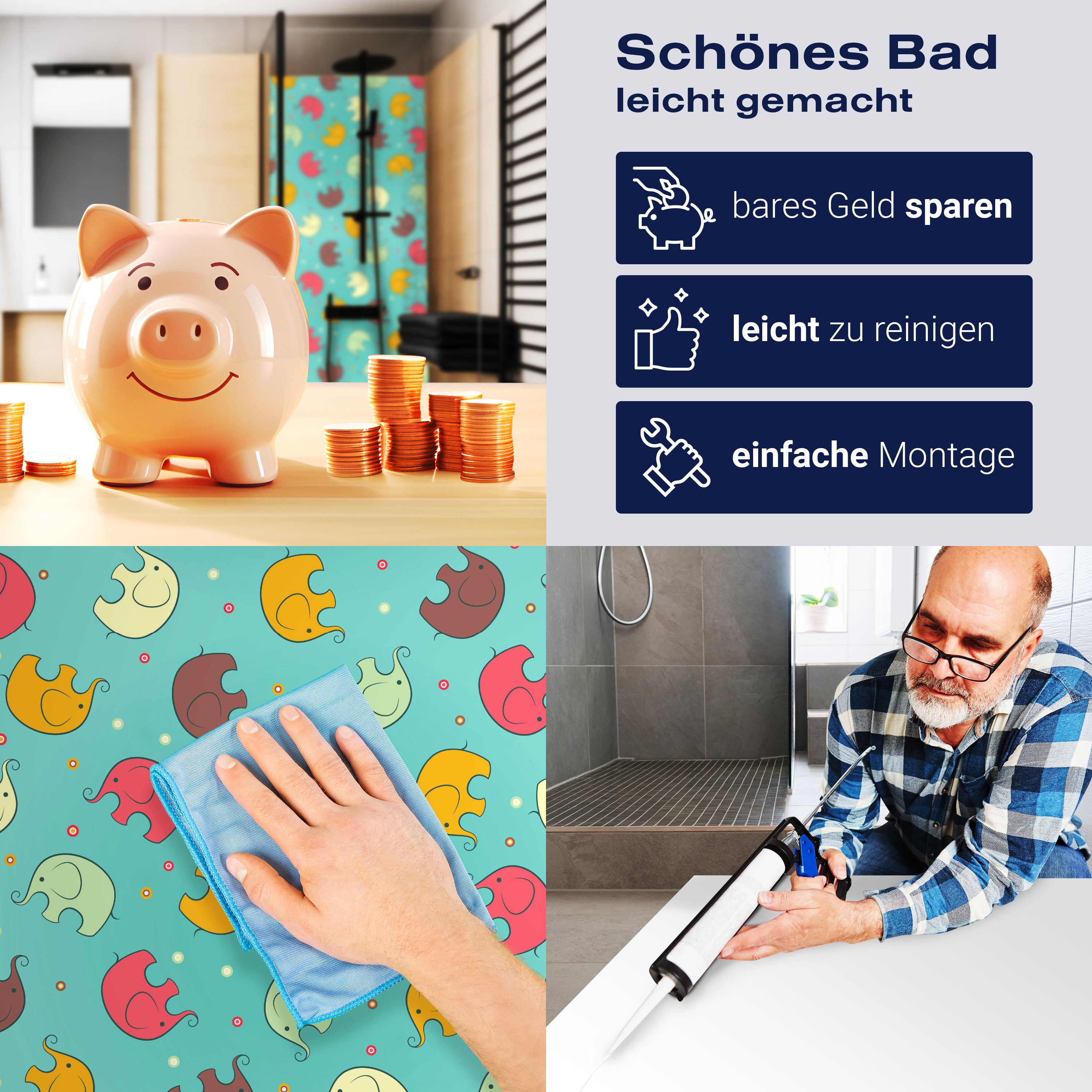 Die Reinigung Deiner Duschwand war noch nie so einfach. In einer Welt, in der Zeit ein kostbares Gut ist, verstehen wir, wie wichtig es ist, Reinigungsprozesse so effizient und mühelos wie möglich zu gestalten. Unsere Duschwände sind speziell dafür entworfen, Dein Leben leichter zu machen. Dank der glatten Oberfläche und der widerstandsfähigen Beschichtung lassen sich Spritzer und Flecken ohne großen Aufwand entfernen – ein schneller Wisch mit einem handelsüblichen Lappen, Spül- oder Wischtuch, und Deine Rückwand sieht aus wie neu.