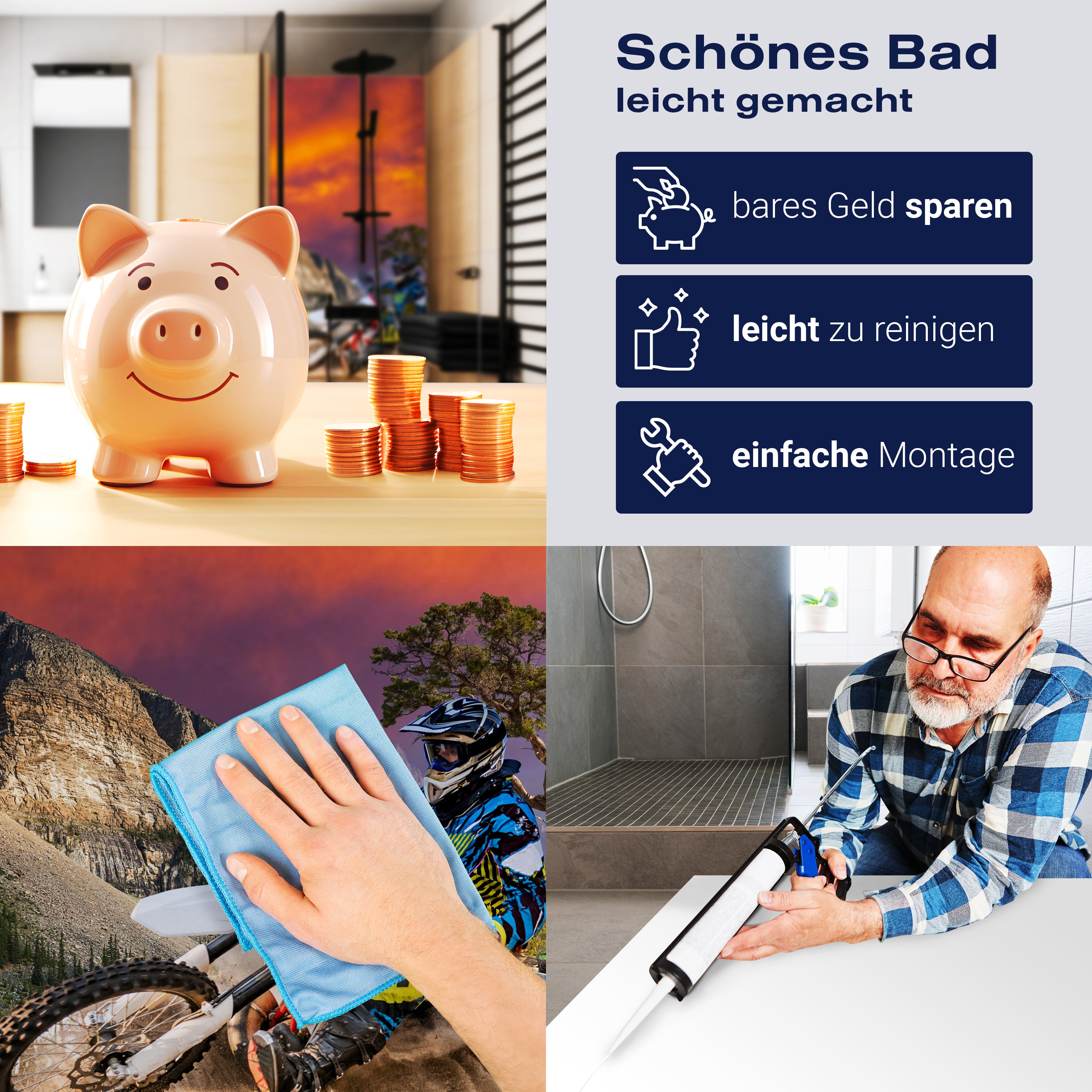 Die Reinigung Deiner Duschwand war noch nie so einfach. In einer Welt, in der Zeit ein kostbares Gut ist, verstehen wir, wie wichtig es ist, Reinigungsprozesse so effizient und mühelos wie möglich zu gestalten. Unsere Duschwände sind speziell dafür entworfen, Dein Leben leichter zu machen. Dank der glatten Oberfläche und der widerstandsfähigen Beschichtung lassen sich Spritzer und Flecken ohne großen Aufwand entfernen – ein schneller Wisch mit einem handelsüblichen Lappen, Spül- oder Wischtuch, und Deine Rückwand sieht aus wie neu.