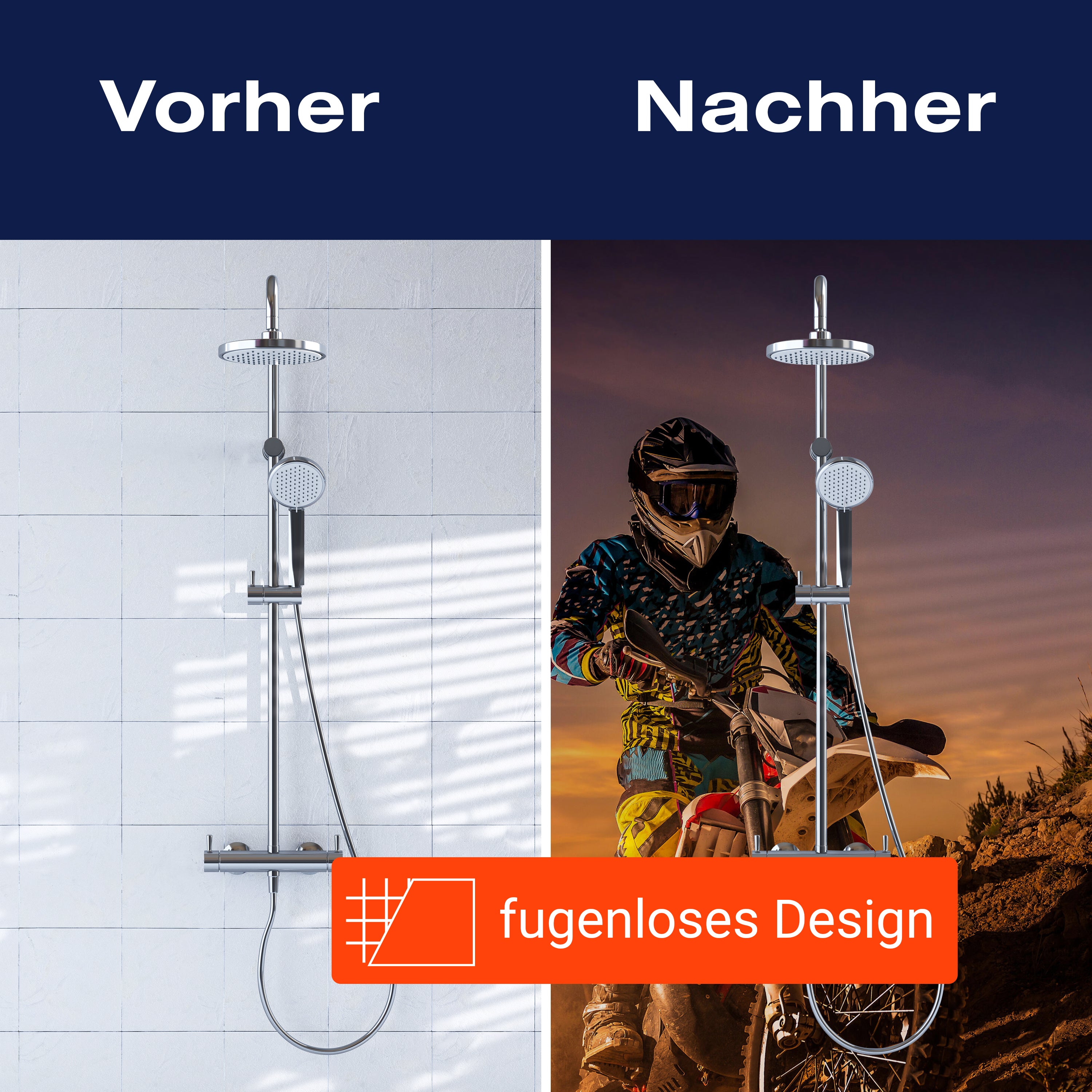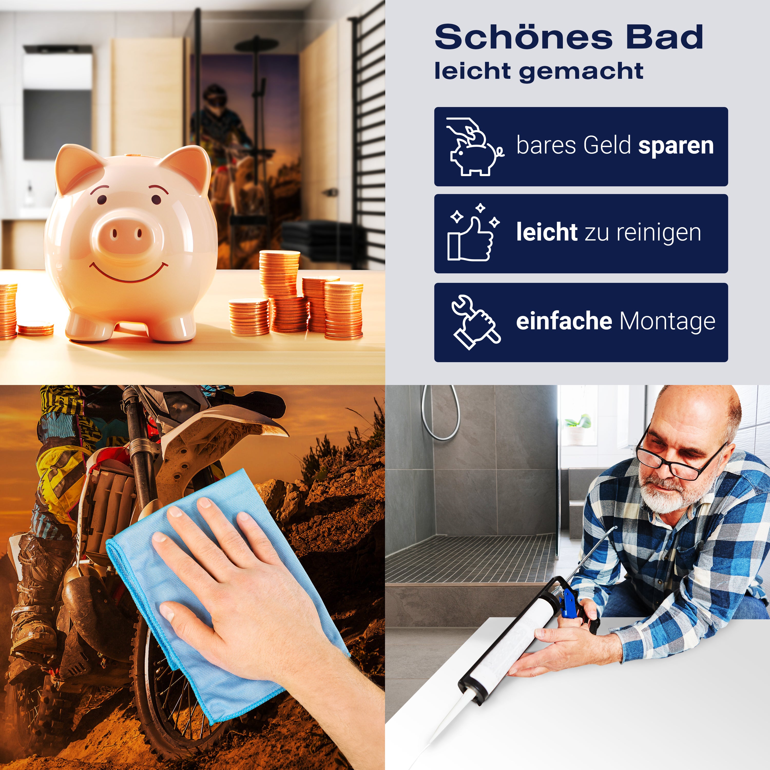 Bist du es leid, auf die langweiligen, schwer zu reinigende Fliesen in deiner Dusche zu schauen? Stell dir vor, wie dein Bad mit einer stilvollen, modernen Rückwand zum Leben erwacht! Unsere Duschwand 'Extreme Biker' ist nicht nur ein optisches Highlight, sondern auch praktisch und pflegeleicht.