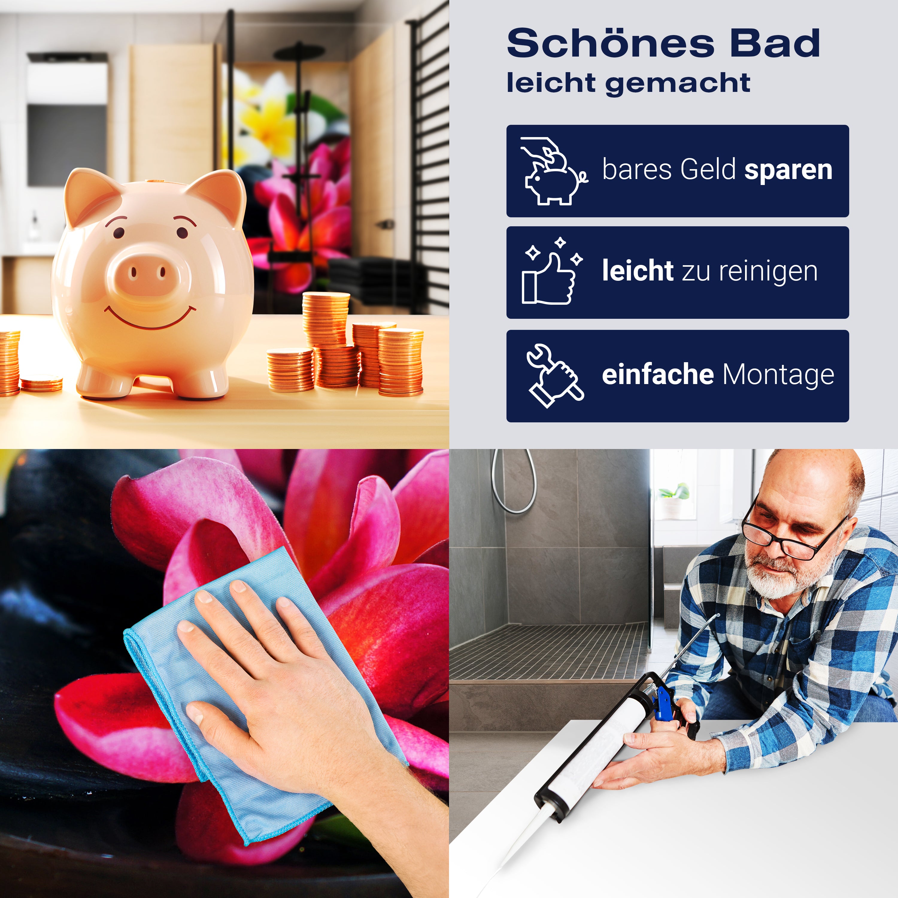 Die Reinigung Deiner Duschwand war noch nie so einfach. In einer Welt, in der Zeit ein kostbares Gut ist, verstehen wir, wie wichtig es ist, Reinigungsprozesse so effizient und mühelos wie möglich zu gestalten. Unsere Duschwände sind speziell dafür entworfen, Dein Leben leichter zu machen. Dank der glatten Oberfläche und der widerstandsfähigen Beschichtung lassen sich Spritzer und Flecken ohne großen Aufwand entfernen – ein schneller Wisch mit einem handelsüblichen Lappen, Spül- oder Wischtuch, und Deine Rückwand sieht aus wie neu.