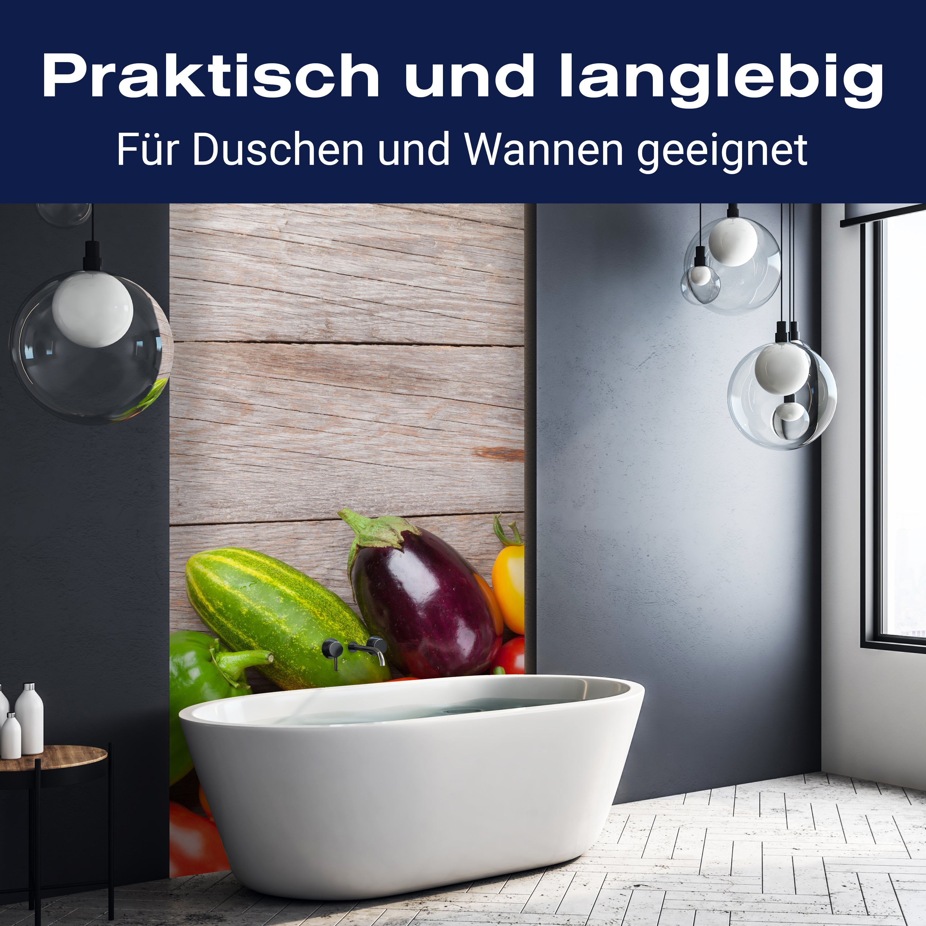 Bist du es leid, auf die langweiligen, schwer zu reinigende Fliesen in deiner Dusche zu schauen? Stell dir vor, wie dein Bad mit einer stilvollen, modernen Rückwand zum Leben erwacht! Unsere Duschwand 'Frisches Gartengemüse' ist nicht nur ein optisches Highlight, sondern auch praktisch und pflegeleicht.