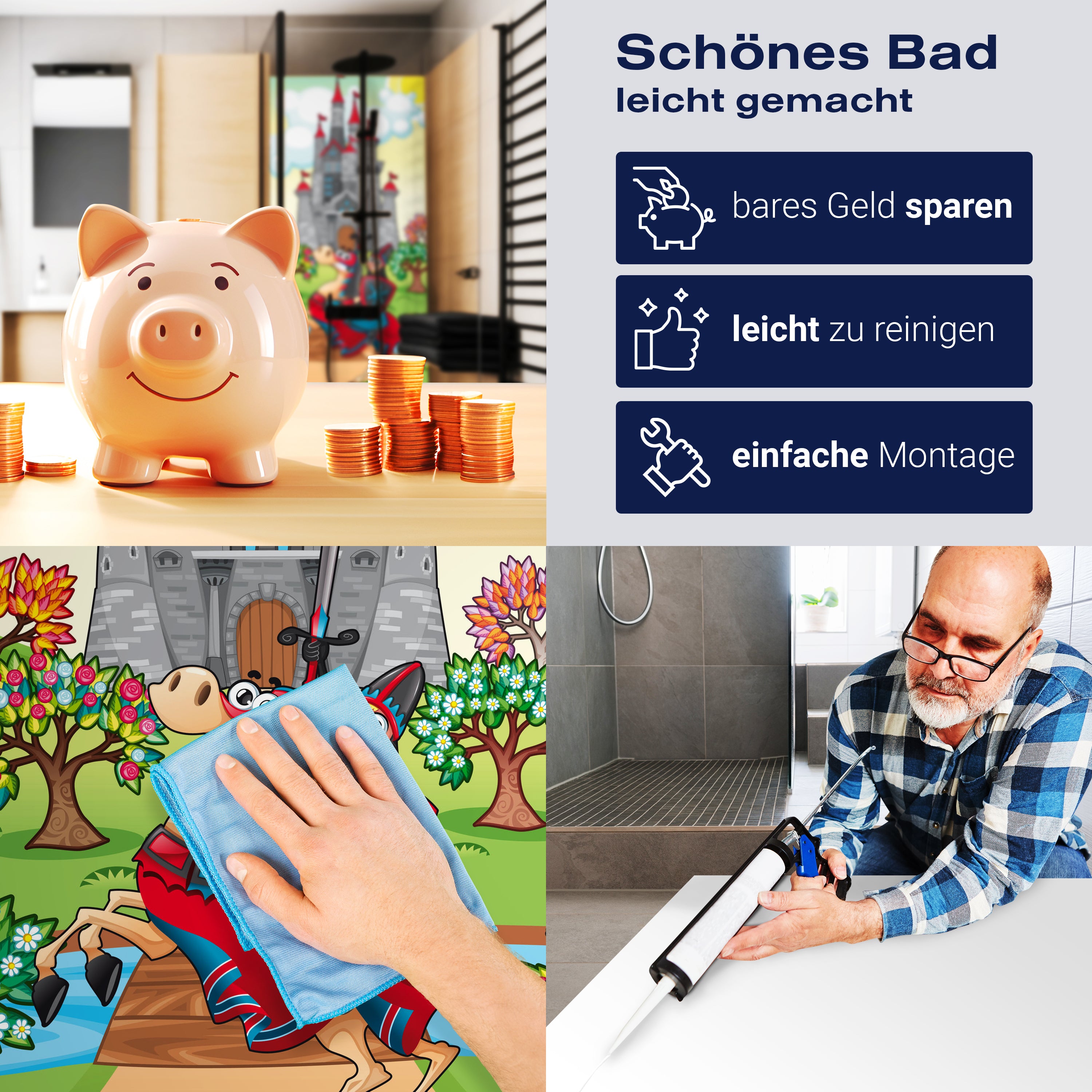 Bist du es leid, auf die langweiligen, schwer zu reinigende Fliesen in deiner Dusche zu schauen? Stell dir vor, wie dein Bad mit einer stilvollen, modernen Rückwand zum Leben erwacht! Unsere Duschwand 'Furchtloser Ritter' ist nicht nur ein optisches Highlight, sondern auch praktisch und pflegeleicht.