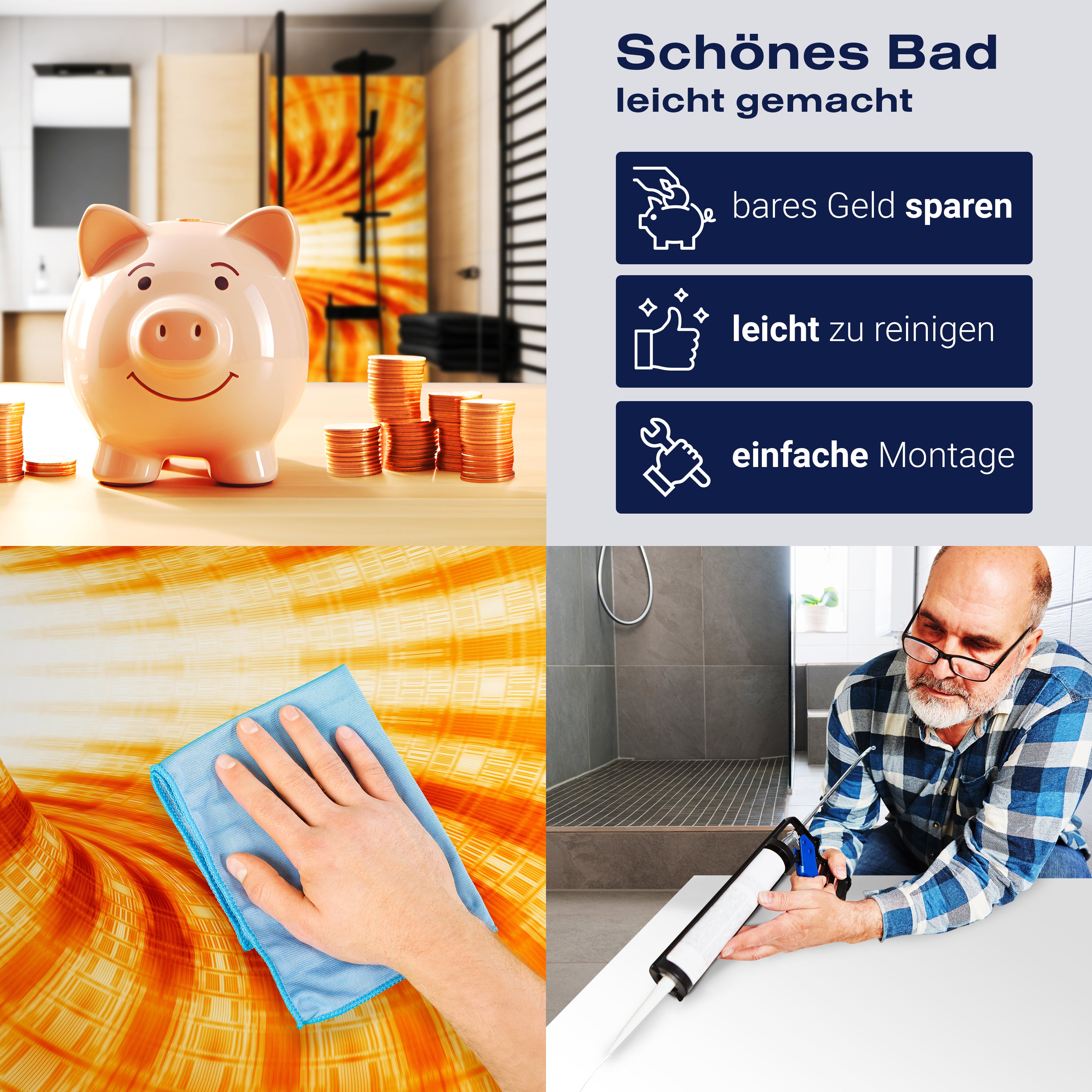 Die Reinigung Deiner Duschwand war noch nie so einfach. In einer Welt, in der Zeit ein kostbares Gut ist, verstehen wir, wie wichtig es ist, Reinigungsprozesse so effizient und mühelos wie möglich zu gestalten. Unsere Duschwände sind speziell dafür entworfen, Dein Leben leichter zu machen. Dank der glatten Oberfläche und der widerstandsfähigen Beschichtung lassen sich Spritzer und Flecken ohne großen Aufwand entfernen – ein schneller Wisch mit einem handelsüblichen Lappen, Spül- oder Wischtuch, und Deine Rückwand sieht aus wie neu.