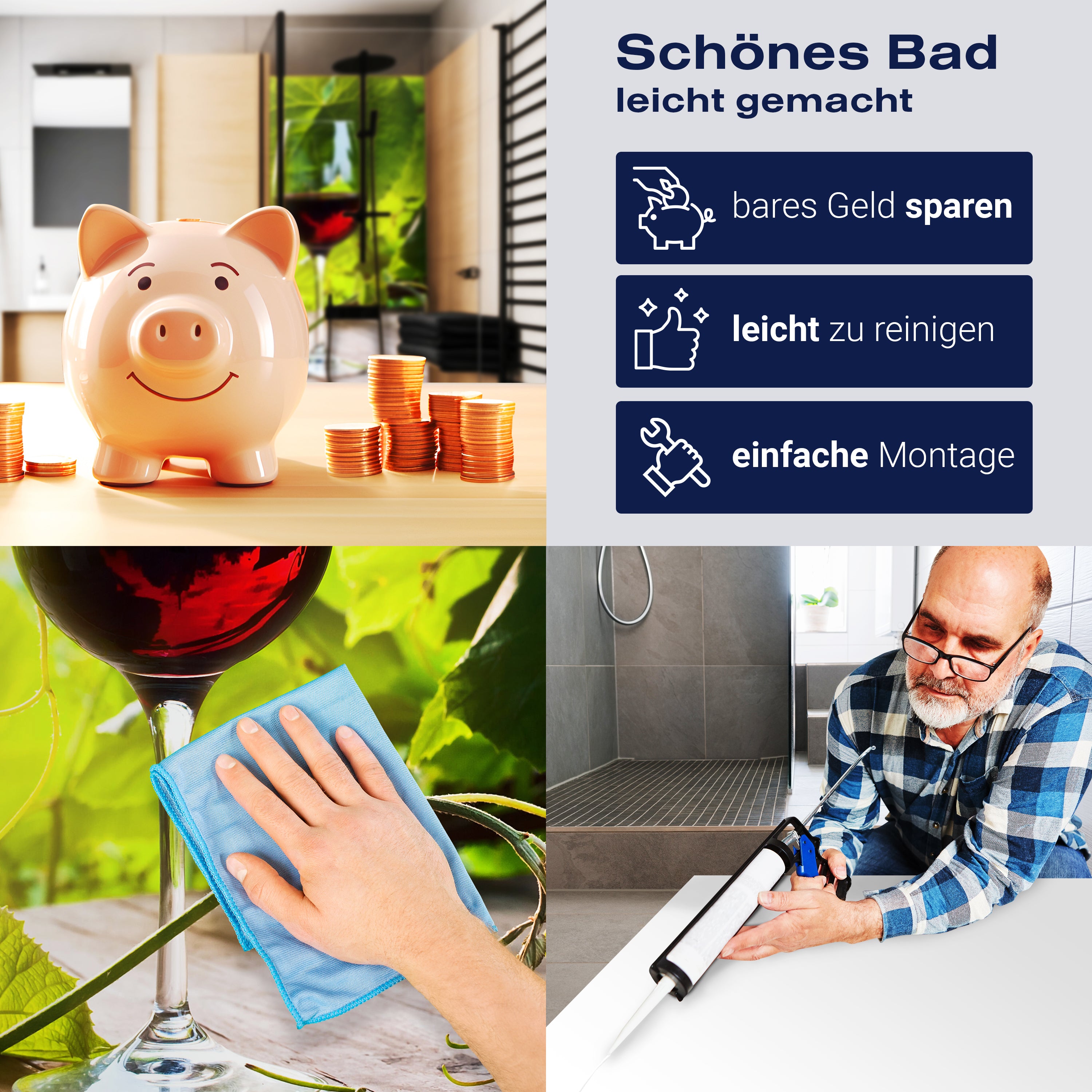 Bist du es leid, auf die langweiligen, schwer zu reinigende Fliesen in deiner Dusche zu schauen? Stell dir vor, wie dein Bad mit einer stilvollen, modernen Rückwand zum Leben erwacht! Unsere Duschwand 'Glas mit Rotwein im Weinberg' ist nicht nur ein optisches Highlight, sondern auch praktisch und pflegeleicht.
