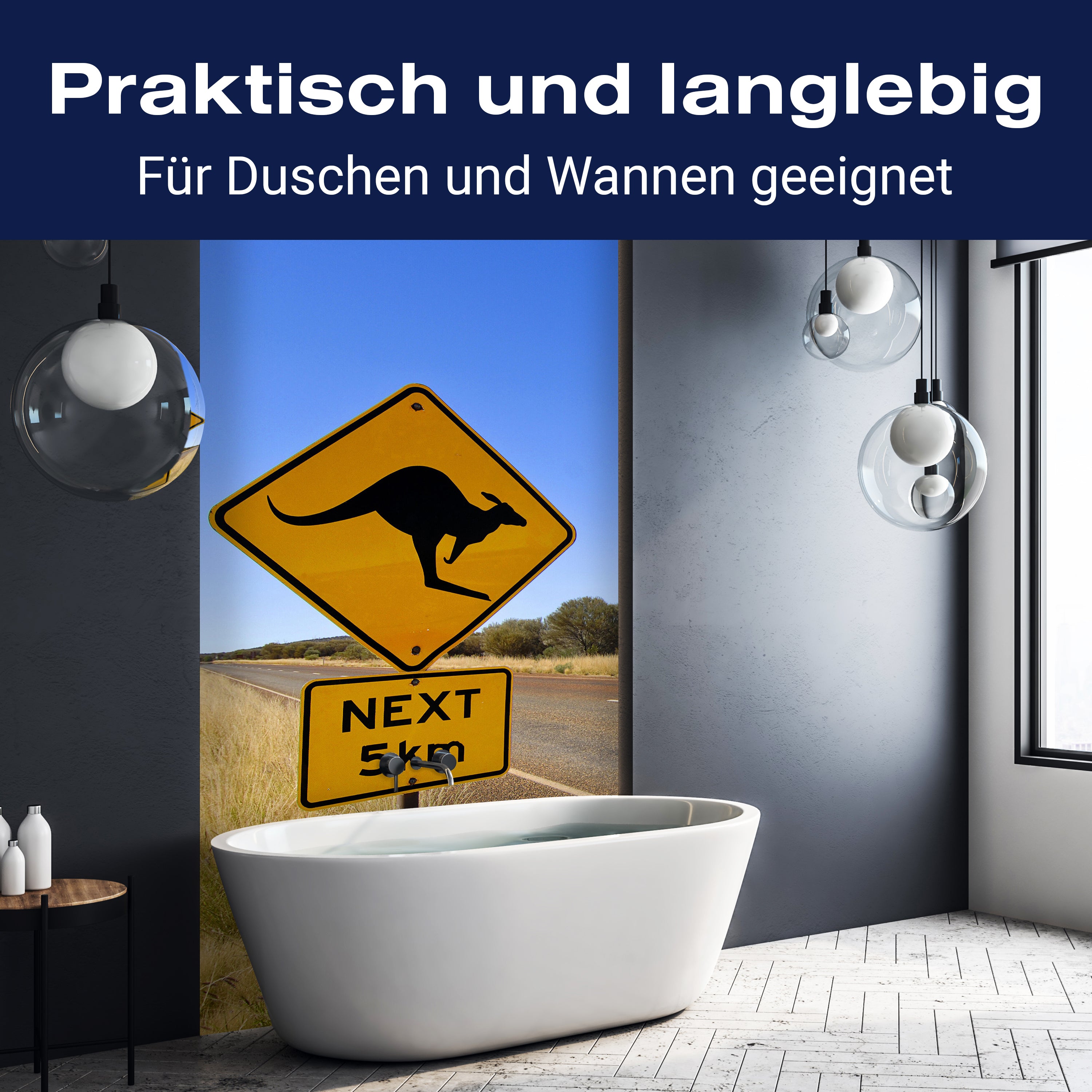Bist du es leid, auf die langweiligen, schwer zu reinigende Fliesen in deiner Dusche zu schauen? Stell dir vor, wie dein Bad mit einer stilvollen, modernen Rückwand zum Leben erwacht! Unsere Duschwand 'Känguruschild' ist nicht nur ein optisches Highlight, sondern auch praktisch und pflegeleicht.