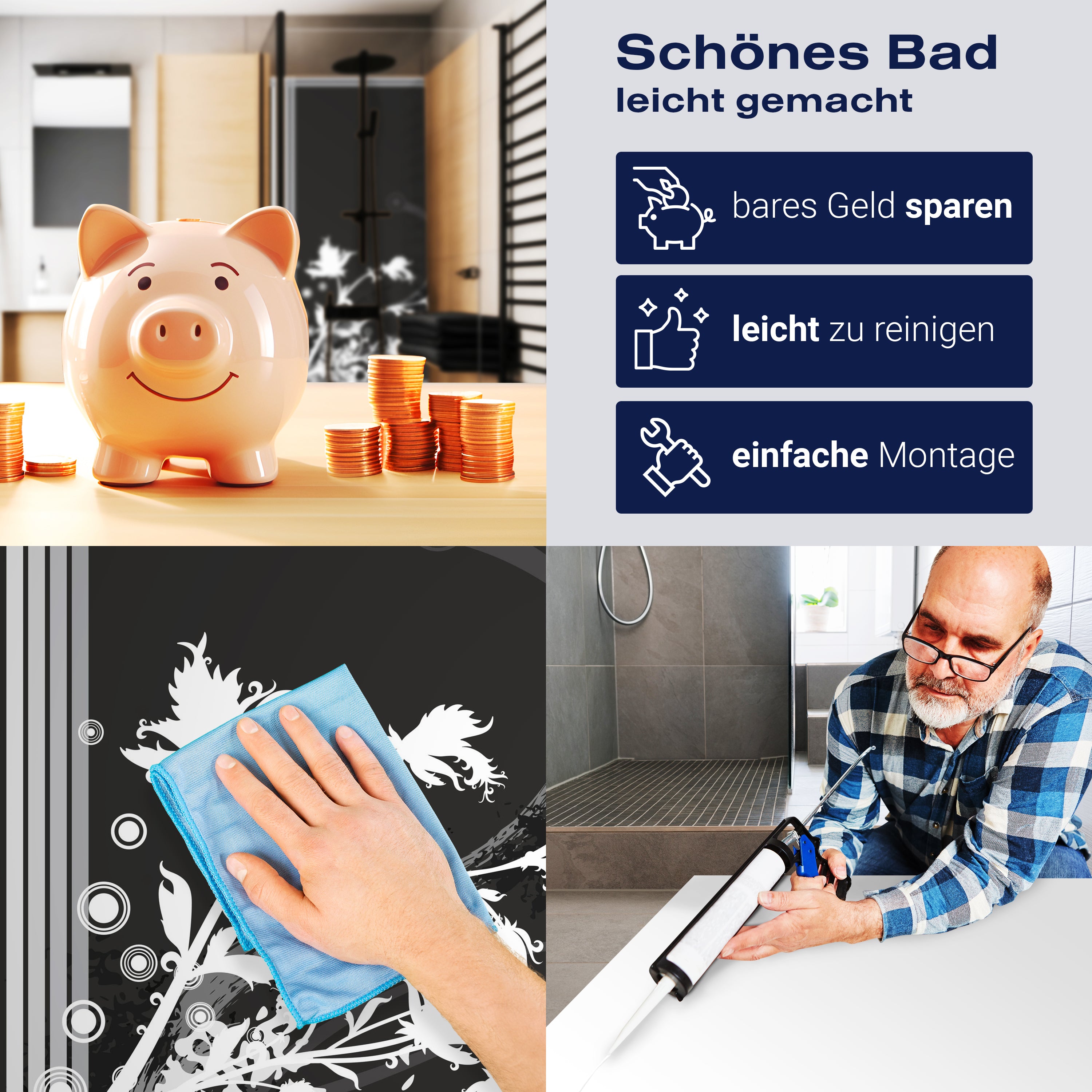 Die Reinigung Deiner Duschwand war noch nie so einfach. In einer Welt, in der Zeit ein kostbares Gut ist, verstehen wir, wie wichtig es ist, Reinigungsprozesse so effizient und mühelos wie möglich zu gestalten. Unsere Duschwände sind speziell dafür entworfen, Dein Leben leichter zu machen. Dank der glatten Oberfläche und der widerstandsfähigen Beschichtung lassen sich Spritzer und Flecken ohne großen Aufwand entfernen – ein schneller Wisch mit einem handelsüblichen Lappen, Spül- oder Wischtuch, und Deine Rückwand sieht aus wie neu.