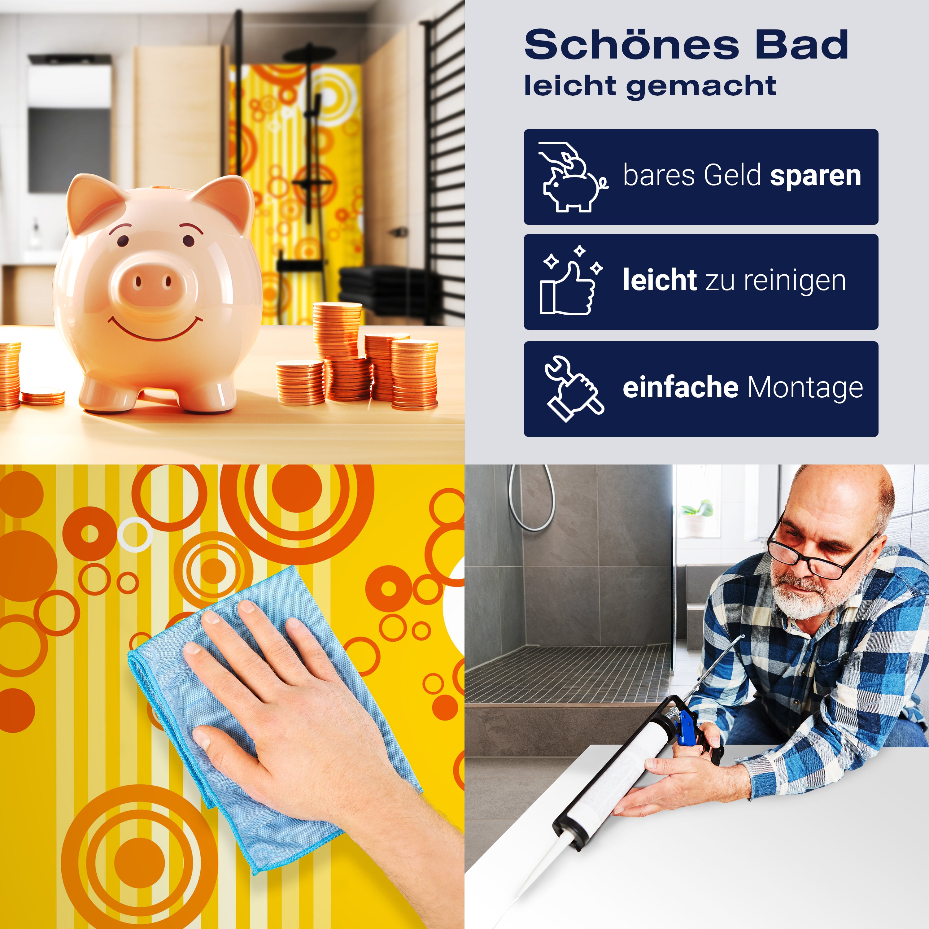 Die Reinigung Deiner Duschwand war noch nie so einfach. In einer Welt, in der Zeit ein kostbares Gut ist, verstehen wir, wie wichtig es ist, Reinigungsprozesse so effizient und mühelos wie möglich zu gestalten. Unsere Duschwände sind speziell dafür entworfen, Dein Leben leichter zu machen. Dank der glatten Oberfläche und der widerstandsfähigen Beschichtung lassen sich Spritzer und Flecken ohne großen Aufwand entfernen – ein schneller Wisch mit einem handelsüblichen Lappen, Spül- oder Wischtuch, und Deine Rückwand sieht aus wie neu.
