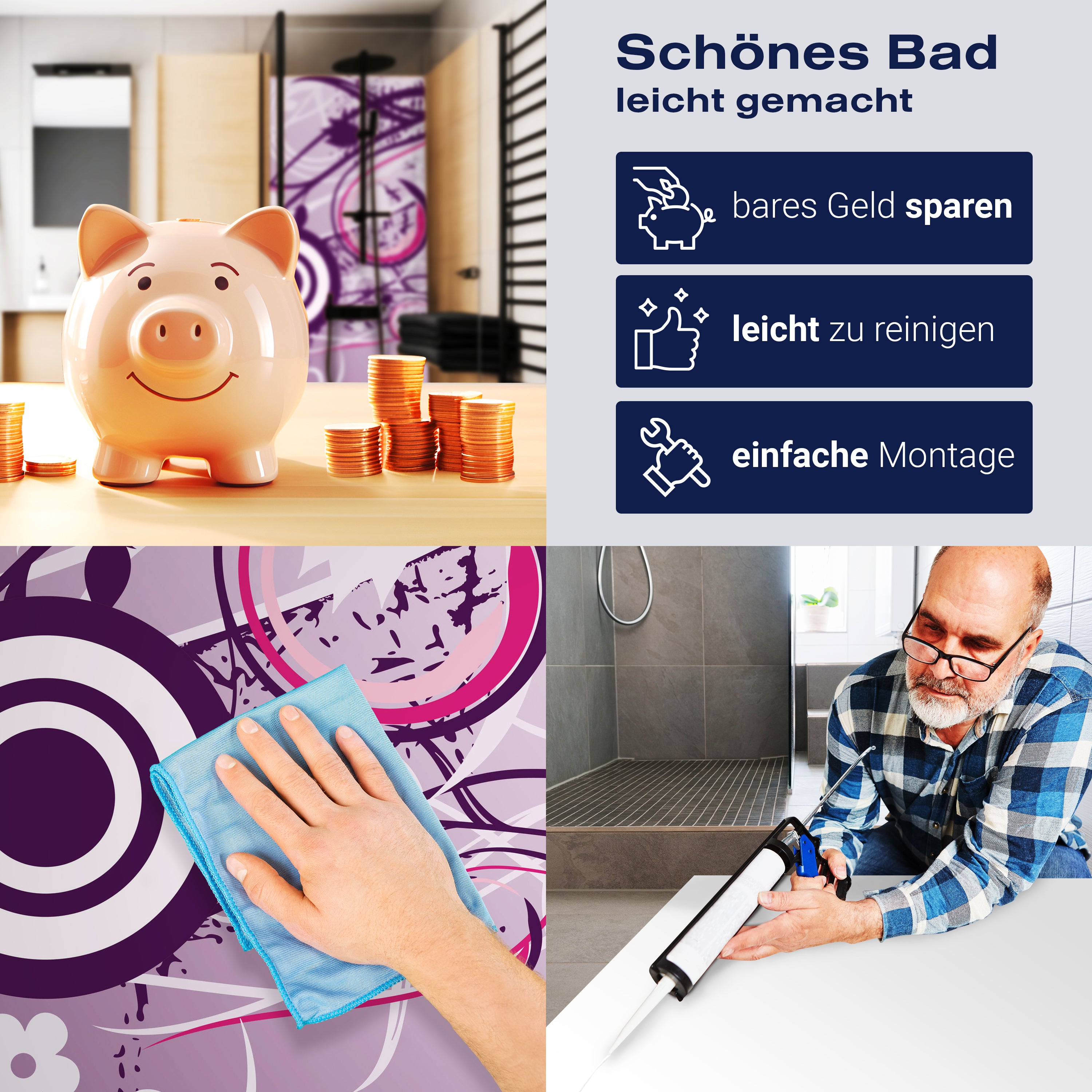 Die Reinigung Deiner Duschwand war noch nie so einfach. In einer Welt, in der Zeit ein kostbares Gut ist, verstehen wir, wie wichtig es ist, Reinigungsprozesse so effizient und mühelos wie möglich zu gestalten. Unsere Duschwände sind speziell dafür entworfen, Dein Leben leichter zu machen. Dank der glatten Oberfläche und der widerstandsfähigen Beschichtung lassen sich Spritzer und Flecken ohne großen Aufwand entfernen – ein schneller Wisch mit einem handelsüblichen Lappen, Spül- oder Wischtuch, und Deine Rückwand sieht aus wie neu.