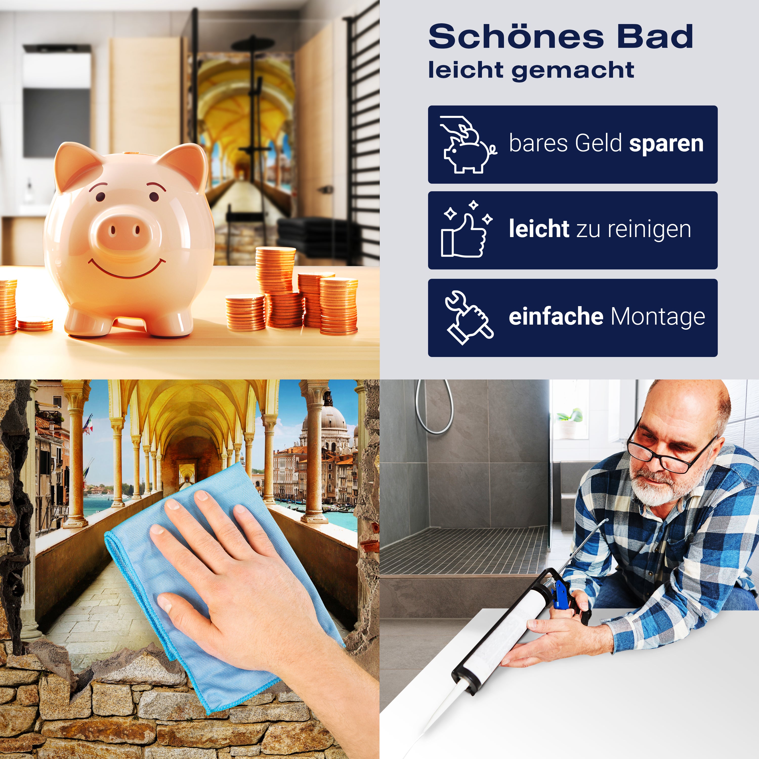 Diese Materialien bieten im Vergleich zu traditionellen Fliesen mehrere Vorteile. Sie haben eine fugenlose Oberfläche, was bedeutet, dass sie weniger anfällig für Schimmelbildung und leichter zu reinigen sind, da sich Schmutz und Kalk nicht in Fugen festsetzen können. Darüber hinaus ermöglichen sie eine schnelle und einfache Renovierung, da sie direkt über bestehenden Fliesen montiert werden können, was Zeit und Kosten spart