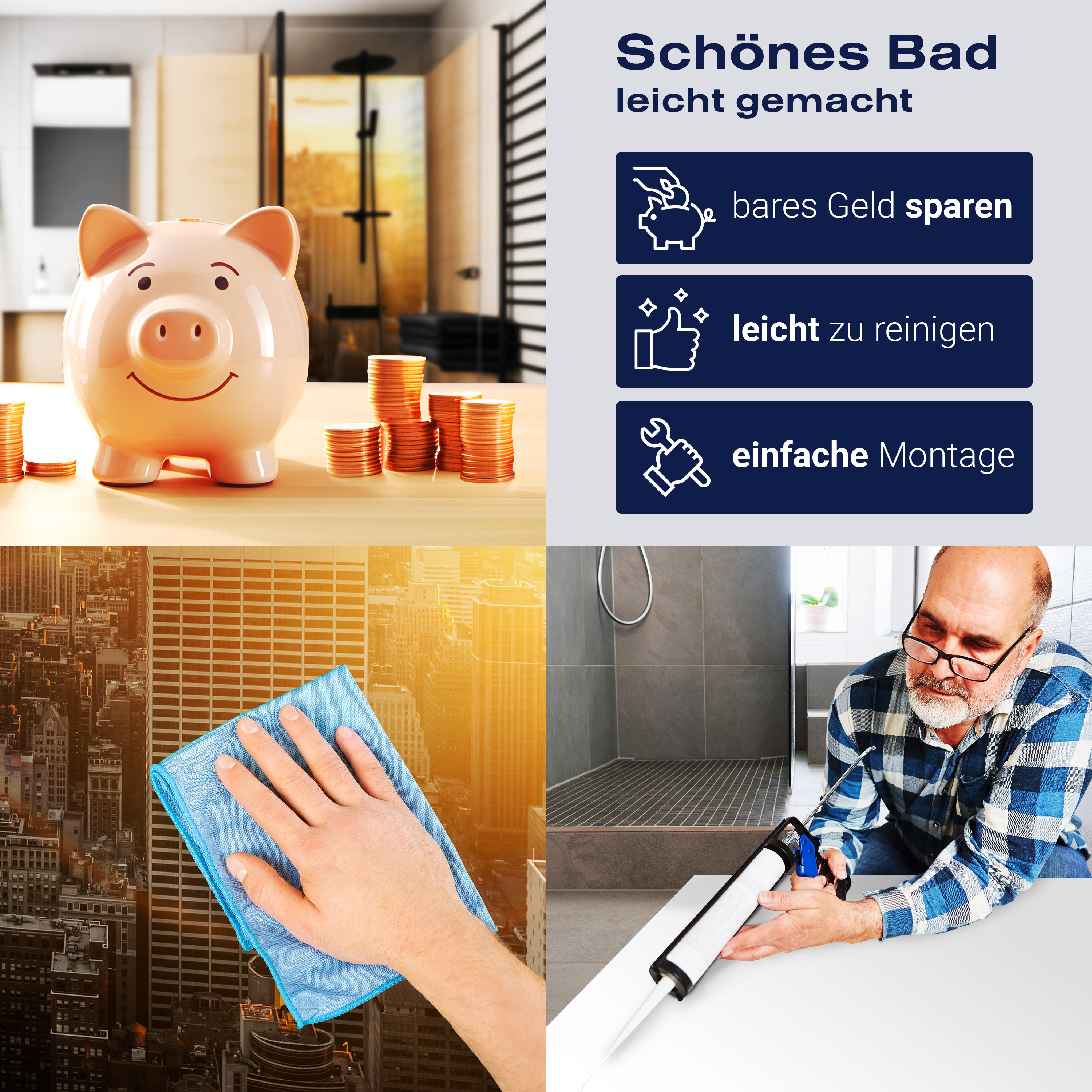 Die Reinigung Deiner Duschwand war noch nie so einfach. In einer Welt, in der Zeit ein kostbares Gut ist, verstehen wir, wie wichtig es ist, Reinigungsprozesse so effizient und mühelos wie möglich zu gestalten. Unsere Duschwände sind speziell dafür entworfen, Dein Leben leichter zu machen. Dank der glatten Oberfläche und der widerstandsfähigen Beschichtung lassen sich Spritzer und Flecken ohne großen Aufwand entfernen – ein schneller Wisch mit einem handelsüblichen Lappen, Spül- oder Wischtuch, und Deine Rückwand sieht aus wie neu.