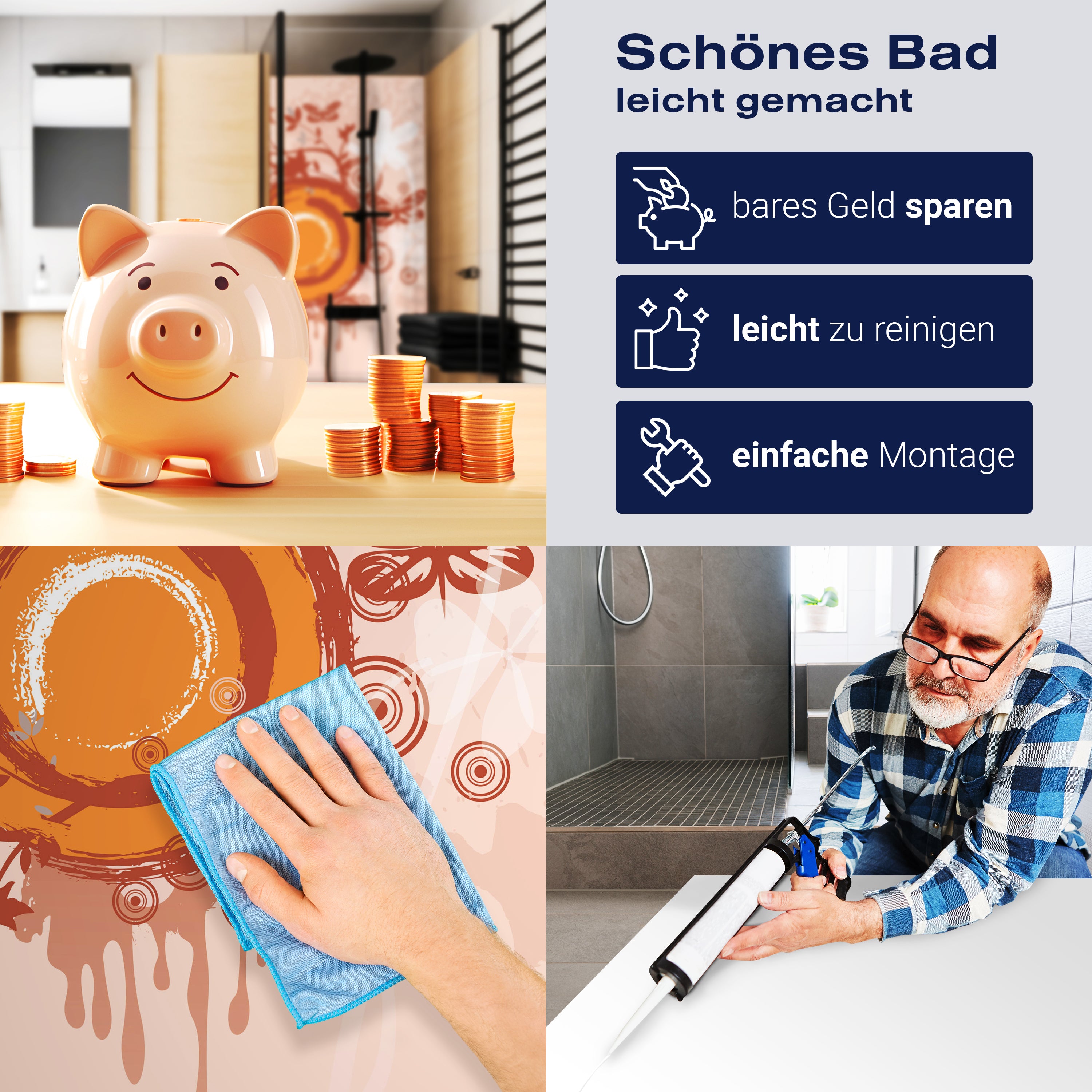 Die Reinigung Deiner Duschwand war noch nie so einfach. In einer Welt, in der Zeit ein kostbares Gut ist, verstehen wir, wie wichtig es ist, Reinigungsprozesse so effizient und mühelos wie möglich zu gestalten. Unsere Duschwände sind speziell dafür entworfen, Dein Leben leichter zu machen. Dank der glatten Oberfläche und der widerstandsfähigen Beschichtung lassen sich Spritzer und Flecken ohne großen Aufwand entfernen – ein schneller Wisch mit einem handelsüblichen Lappen, Spül- oder Wischtuch, und Deine Rückwand sieht aus wie neu.