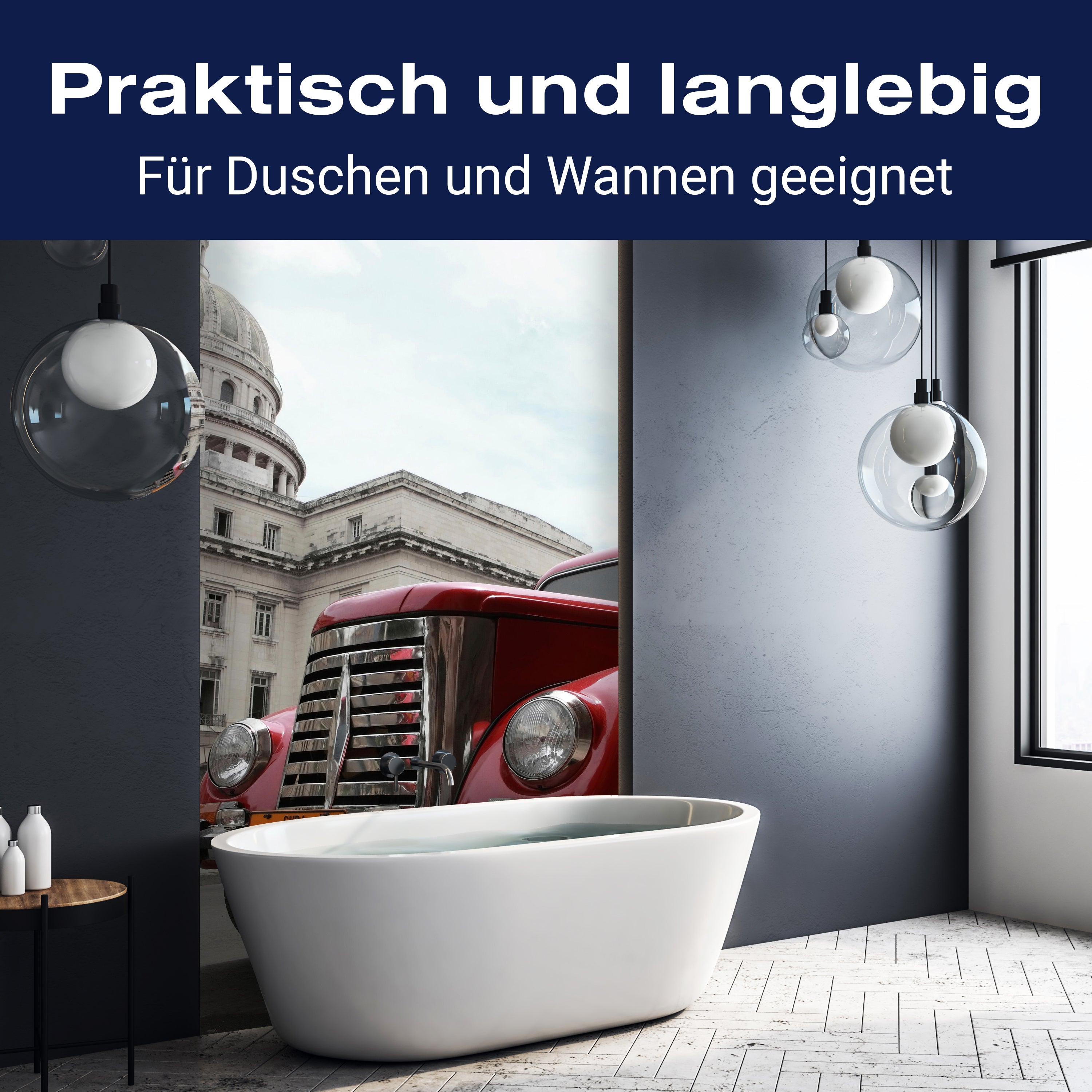 Vergiss die Tage, an denen Spritzer und Flecken deine Dusche ruiniert haben. Mit der Duschrückwand 'Oldtimer' gehören solche Sorgen der Vergangenheit an. Das hochwertige Material sorgt dafür, dass deine Dusche gegen Wasser und andere alltägliche Missgeschicke resistent ist. Ein einfacher Wisch, und sie sieht aus wie neu – ohne den Einsatz von aggressiven Reinigungsmitteln.