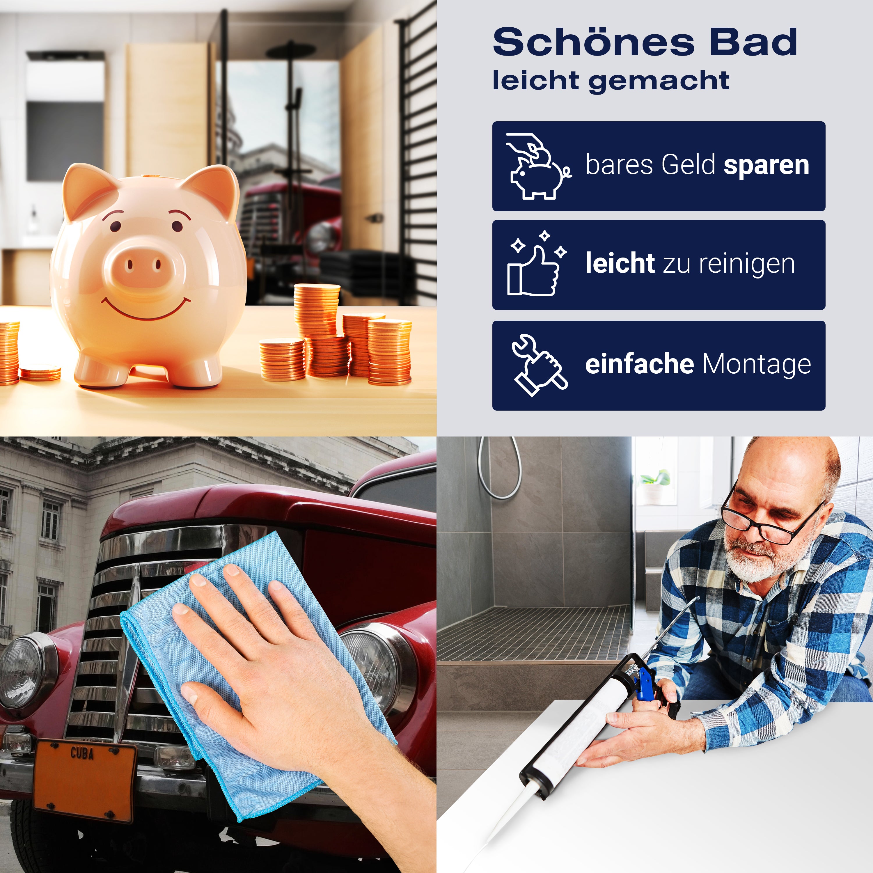 Die Reinigung Deiner Duschwand war noch nie so einfach. In einer Welt, in der Zeit ein kostbares Gut ist, verstehen wir, wie wichtig es ist, Reinigungsprozesse so effizient und mühelos wie möglich zu gestalten. Unsere Duschwände sind speziell dafür entworfen, Dein Leben leichter zu machen. Dank der glatten Oberfläche und der widerstandsfähigen Beschichtung lassen sich Spritzer und Flecken ohne großen Aufwand entfernen – ein schneller Wisch mit einem handelsüblichen Lappen, Spül- oder Wischtuch, und Deine Rückwand sieht aus wie neu.
