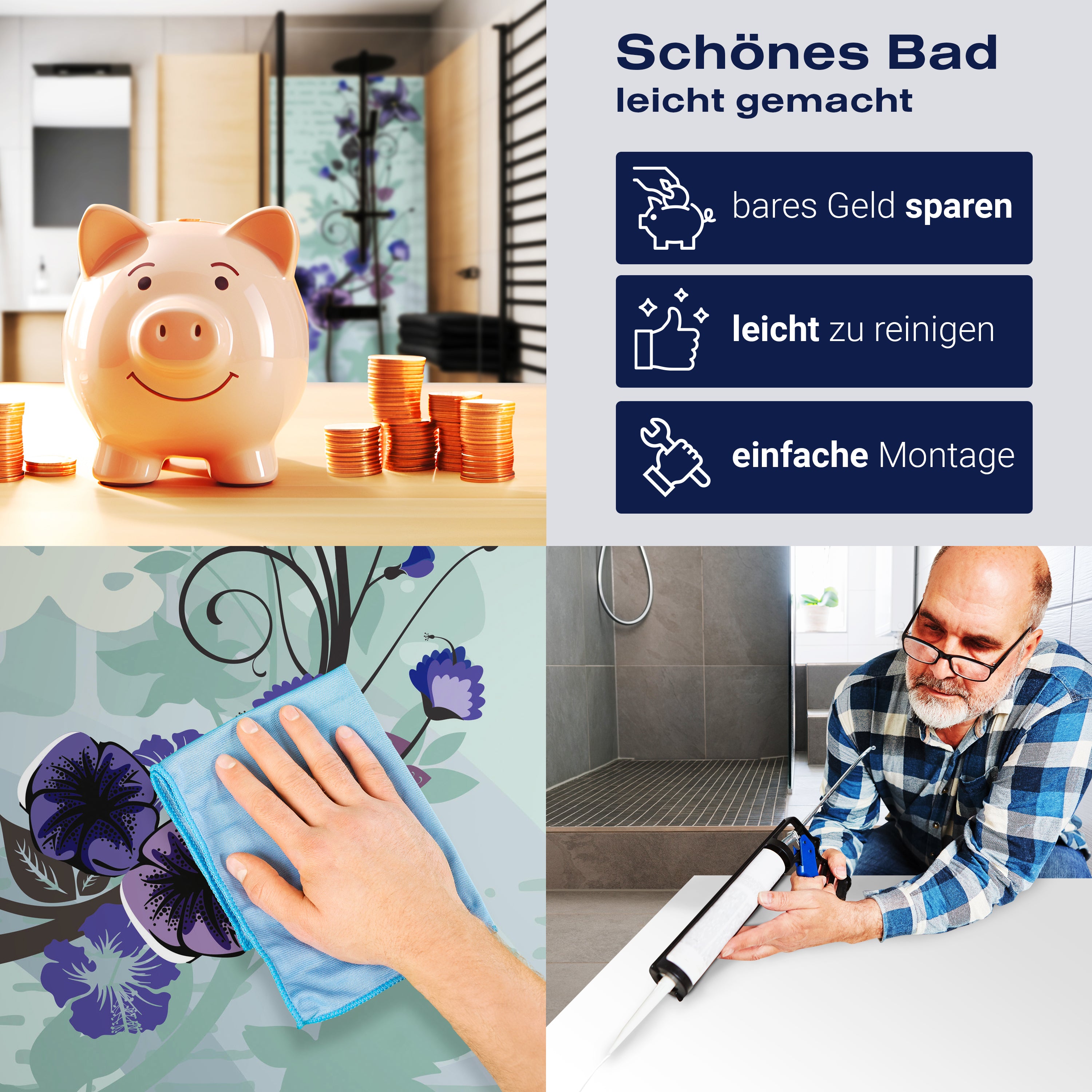 Die Reinigung Deiner Duschwand war noch nie so einfach. In einer Welt, in der Zeit ein kostbares Gut ist, verstehen wir, wie wichtig es ist, Reinigungsprozesse so effizient und mühelos wie möglich zu gestalten. Unsere Duschwände sind speziell dafür entworfen, Dein Leben leichter zu machen. Dank der glatten Oberfläche und der widerstandsfähigen Beschichtung lassen sich Spritzer und Flecken ohne großen Aufwand entfernen – ein schneller Wisch mit einem handelsüblichen Lappen, Spül- oder Wischtuch, und Deine Rückwand sieht aus wie neu.