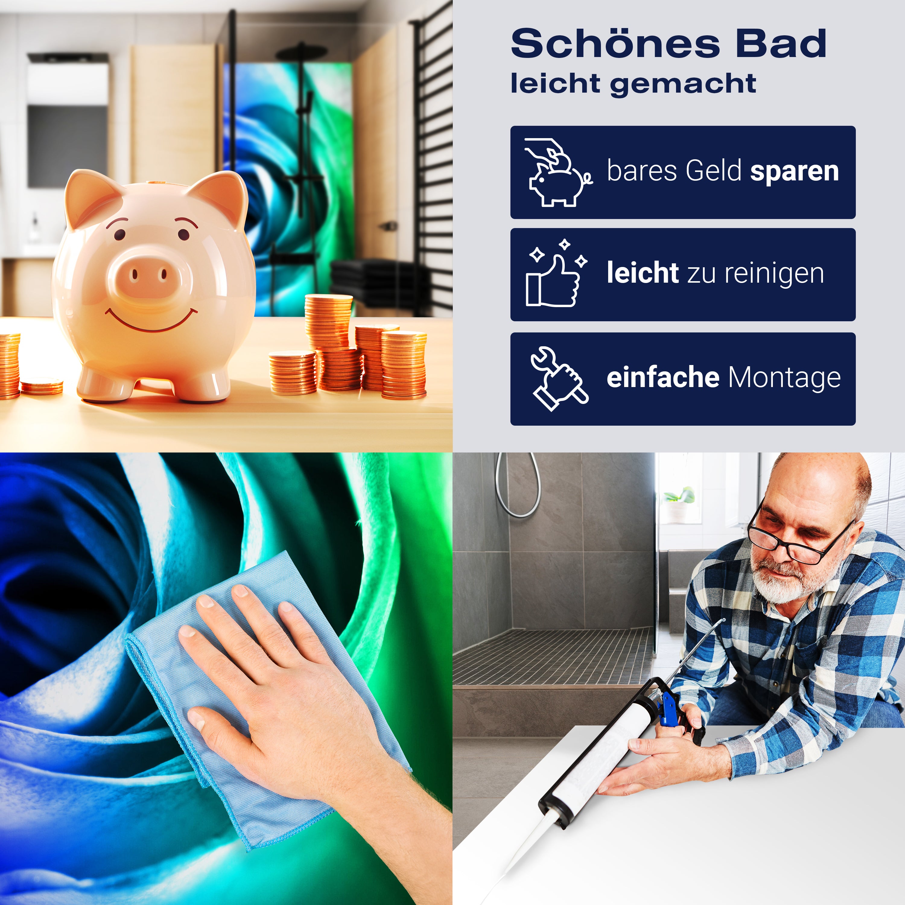 Die Reinigung Deiner Duschwand war noch nie so einfach. In einer Welt, in der Zeit ein kostbares Gut ist, verstehen wir, wie wichtig es ist, Reinigungsprozesse so effizient und mühelos wie möglich zu gestalten. Unsere Duschwände sind speziell dafür entworfen, Dein Leben leichter zu machen. Dank der glatten Oberfläche und der widerstandsfähigen Beschichtung lassen sich Spritzer und Flecken ohne großen Aufwand entfernen – ein schneller Wisch mit einem handelsüblichen Lappen, Spül- oder Wischtuch, und Deine Rückwand sieht aus wie neu.