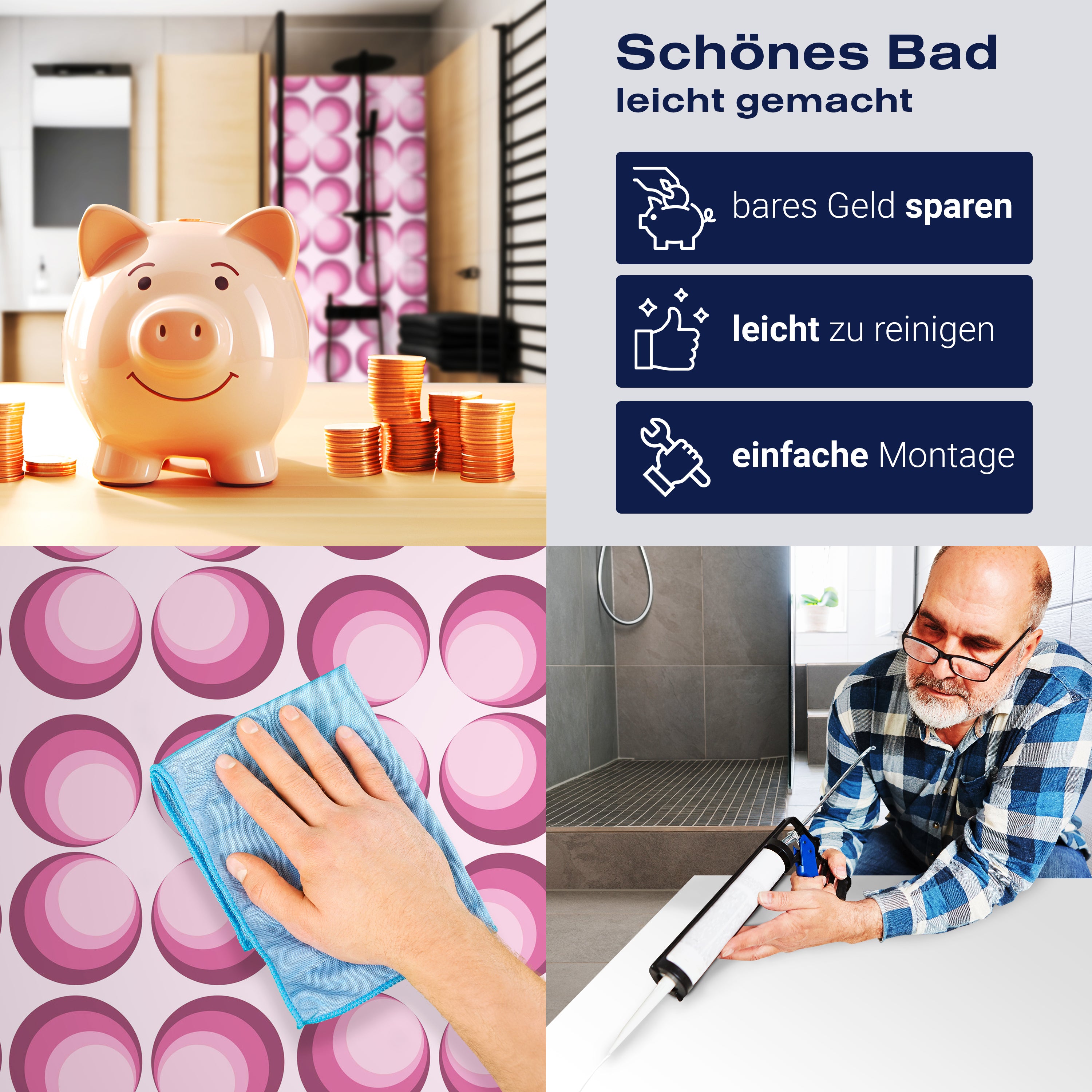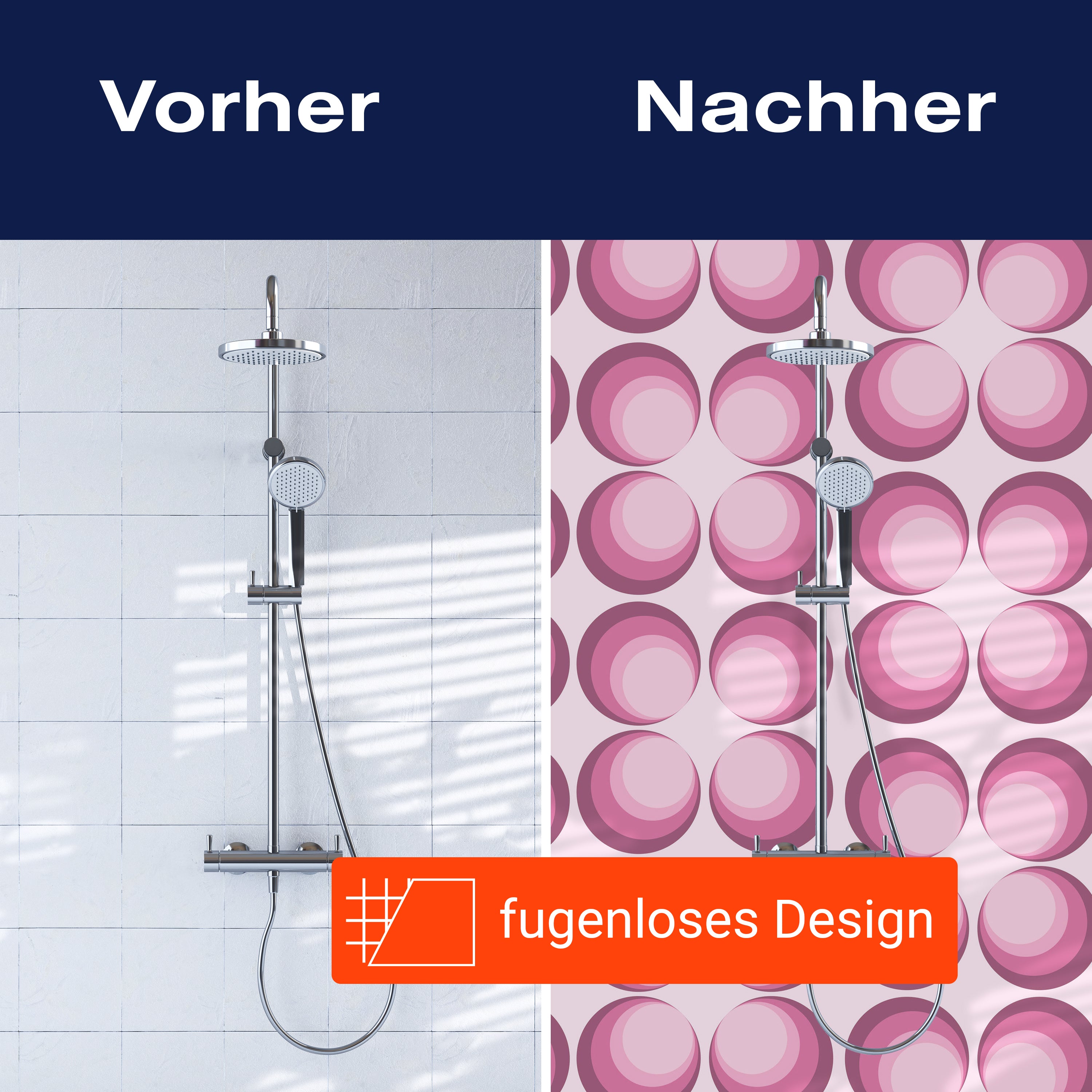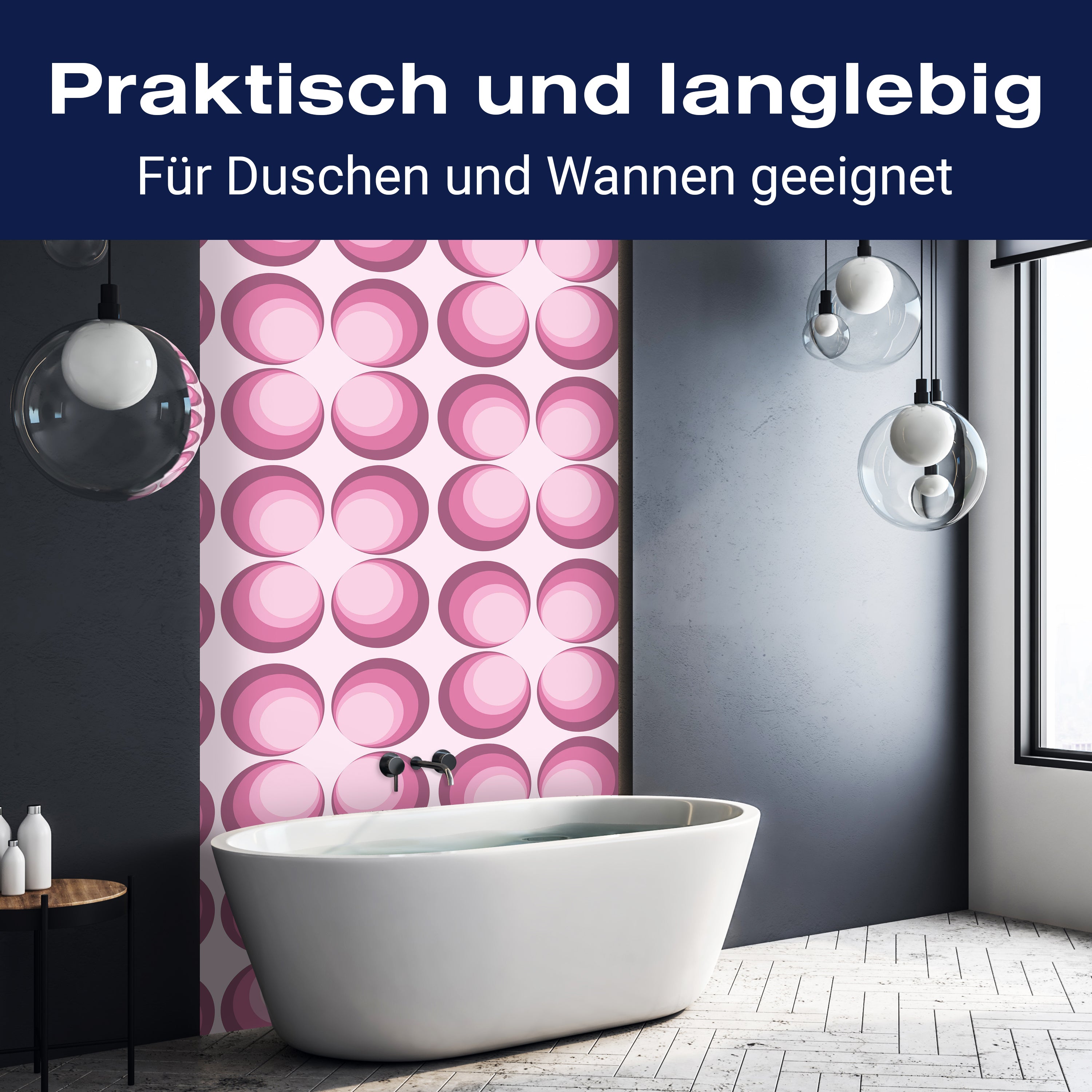 Bist du es leid, auf die langweiligen, schwer zu reinigende Fliesen in deiner Dusche zu schauen? Stell dir vor, wie dein Bad mit einer stilvollen, modernen Rückwand zum Leben erwacht! Unsere Duschwand 'Retrokreise Rosa Muster' ist nicht nur ein optisches Highlight, sondern auch praktisch und pflegeleicht.