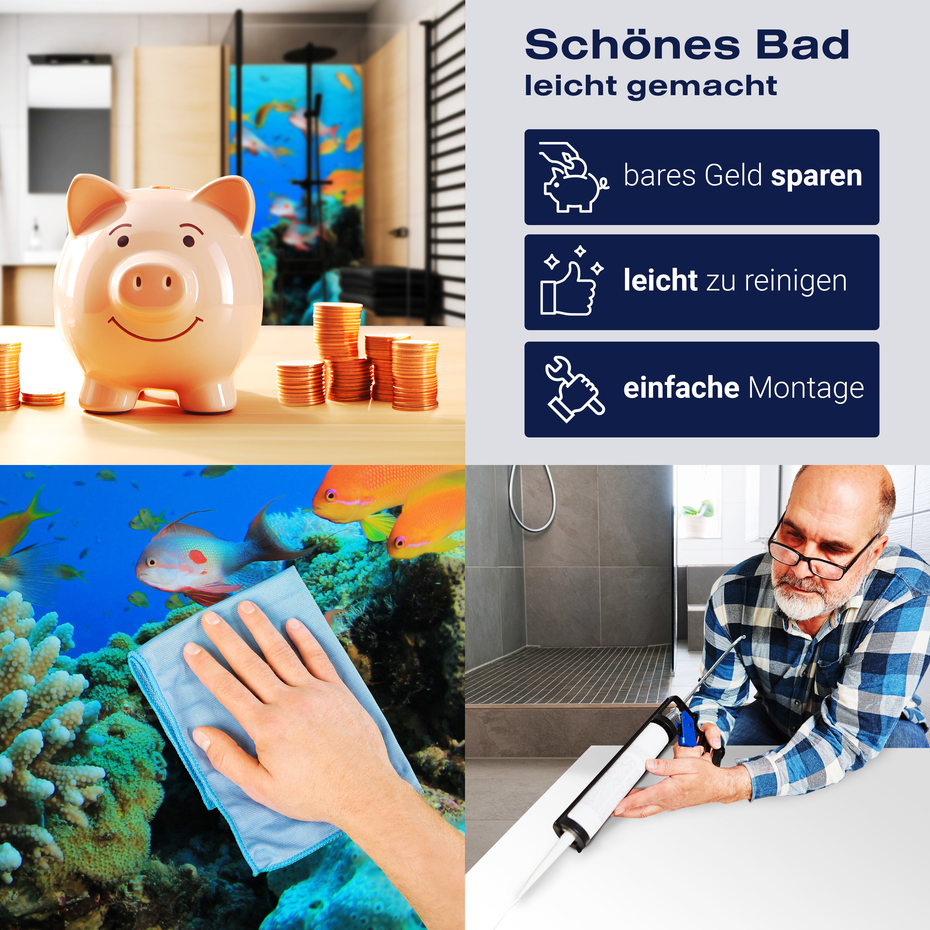 Bist du es leid, auf die langweiligen, schwer zu reinigende Fliesen in deiner Dusche zu schauen? Stell dir vor, wie dein Bad mit einer stilvollen, modernen Rückwand zum Leben erwacht! Unsere Duschwand 'Riffleben Unterwasser' ist nicht nur ein optisches Highlight, sondern auch praktisch und pflegeleicht.