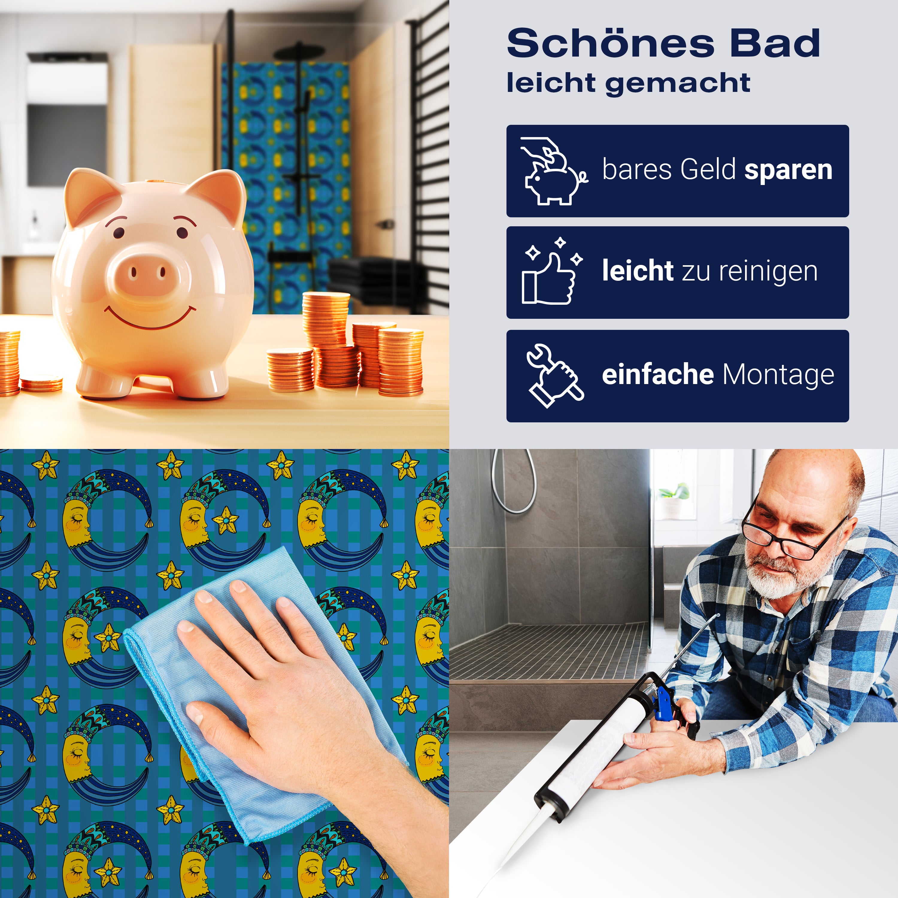Bist du es leid, auf die langweiligen, schwer zu reinigende Fliesen in deiner Dusche zu schauen? Stell dir vor, wie dein Bad mit einer stilvollen, modernen Rückwand zum Leben erwacht! Unsere Duschwand 'Schläfriger Mond' ist nicht nur ein optisches Highlight, sondern auch praktisch und pflegeleicht.