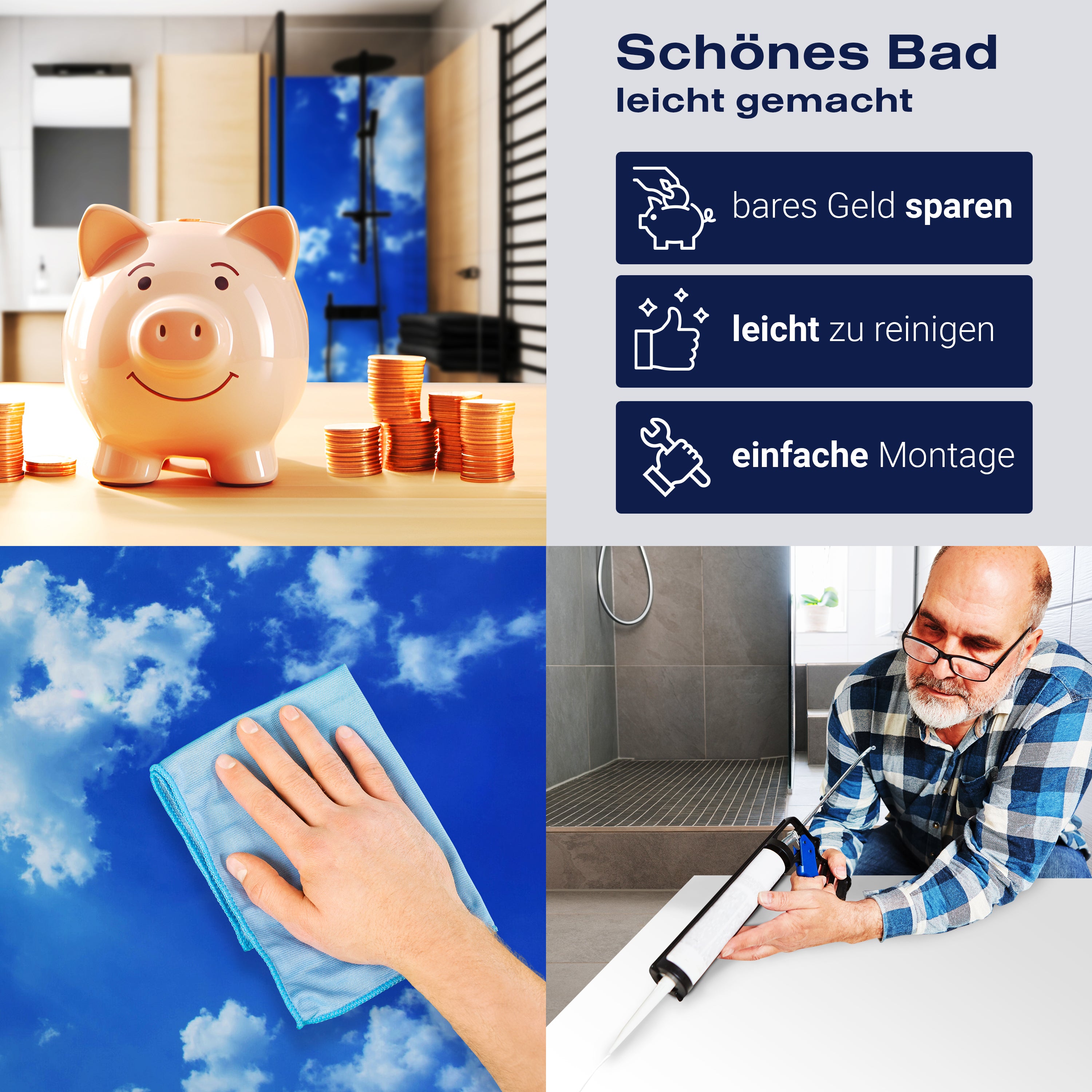 Bist du es leid, auf die langweiligen, schwer zu reinigende Fliesen in deiner Dusche zu schauen? Stell dir vor, wie dein Bad mit einer stilvollen, modernen Rückwand zum Leben erwacht! Unsere Duschwand 'Sommerhimmel' ist nicht nur ein optisches Highlight, sondern auch praktisch und pflegeleicht.