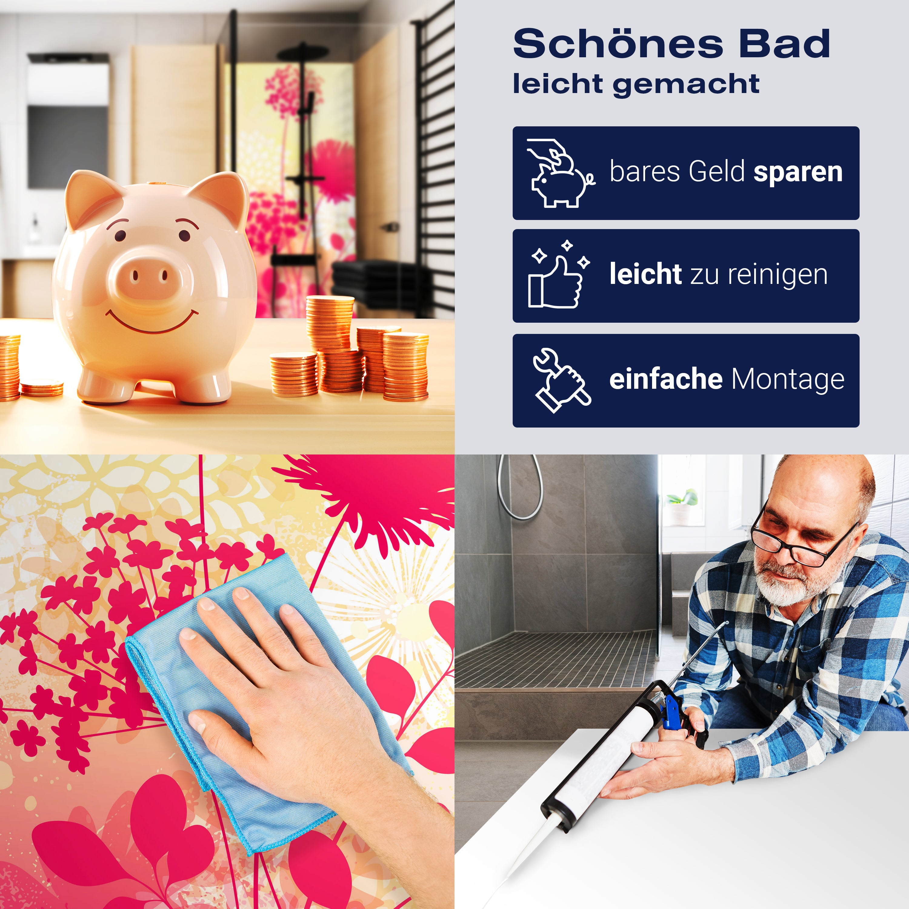 Die Reinigung Deiner Duschwand war noch nie so einfach. In einer Welt, in der Zeit ein kostbares Gut ist, verstehen wir, wie wichtig es ist, Reinigungsprozesse so effizient und mühelos wie möglich zu gestalten. Unsere Duschwände sind speziell dafür entworfen, Dein Leben leichter zu machen. Dank der glatten Oberfläche und der widerstandsfähigen Beschichtung lassen sich Spritzer und Flecken ohne großen Aufwand entfernen – ein schneller Wisch mit einem handelsüblichen Lappen, Spül- oder Wischtuch, und Deine Rückwand sieht aus wie neu.