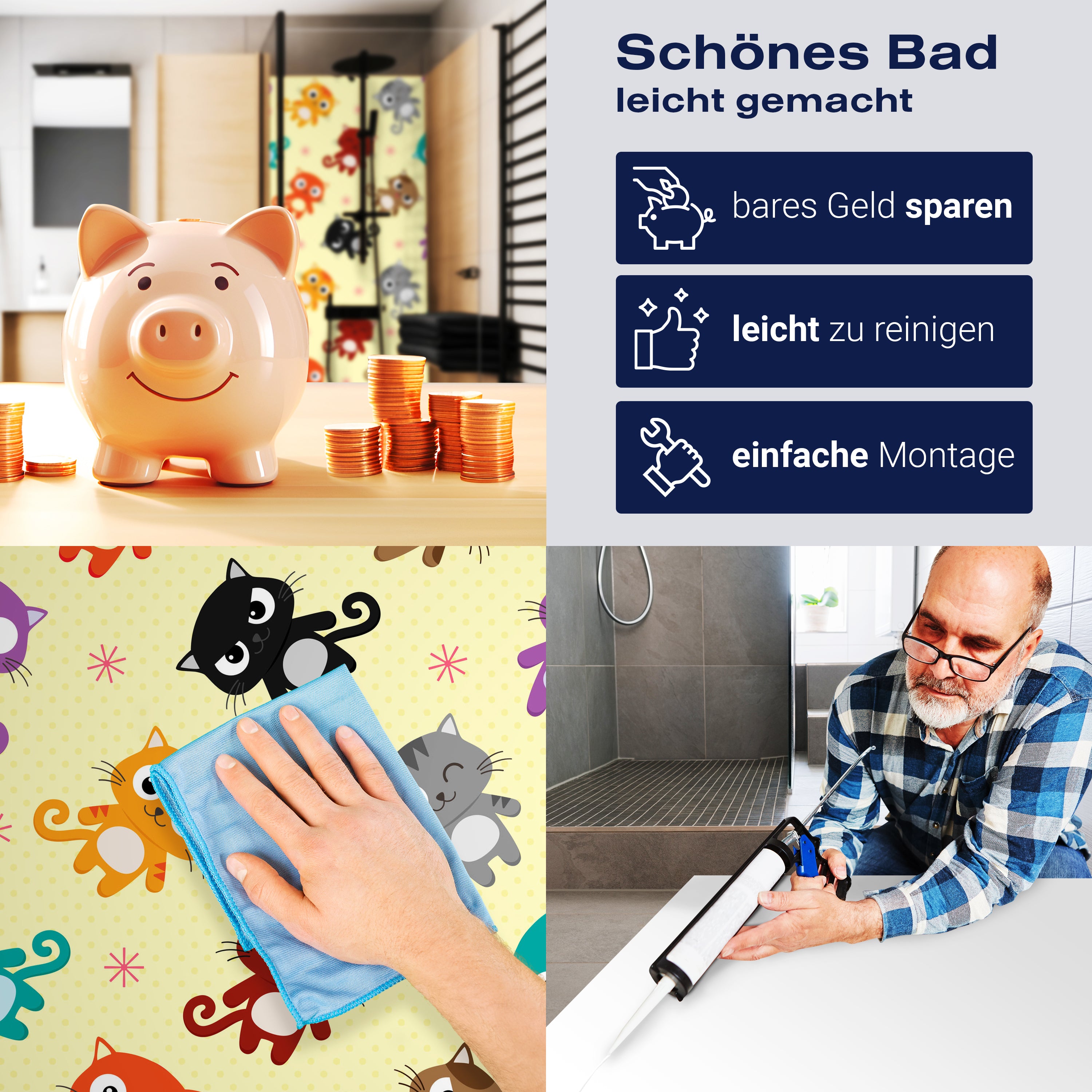Bist du es leid, auf die langweiligen, schwer zu reinigende Fliesen in deiner Dusche zu schauen? Stell dir vor, wie dein Bad mit einer stilvollen, modernen Rückwand zum Leben erwacht! Unsere Duschwand 'süße Kätzchen' ist nicht nur ein optisches Highlight, sondern auch praktisch und pflegeleicht.