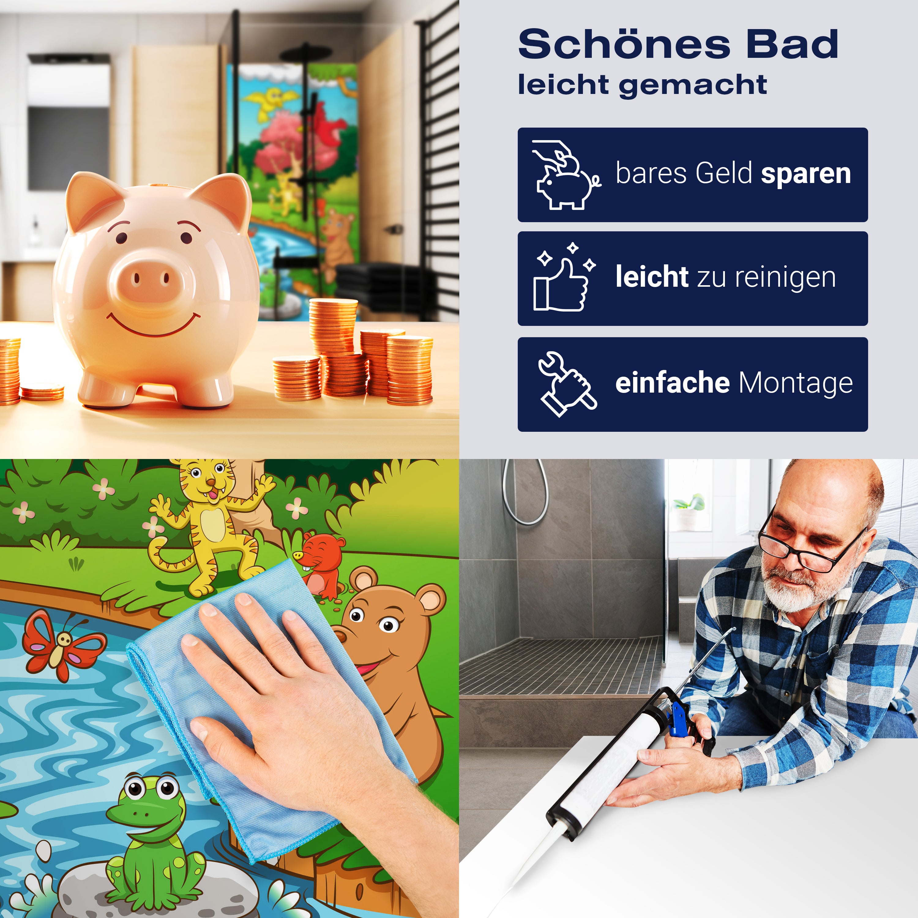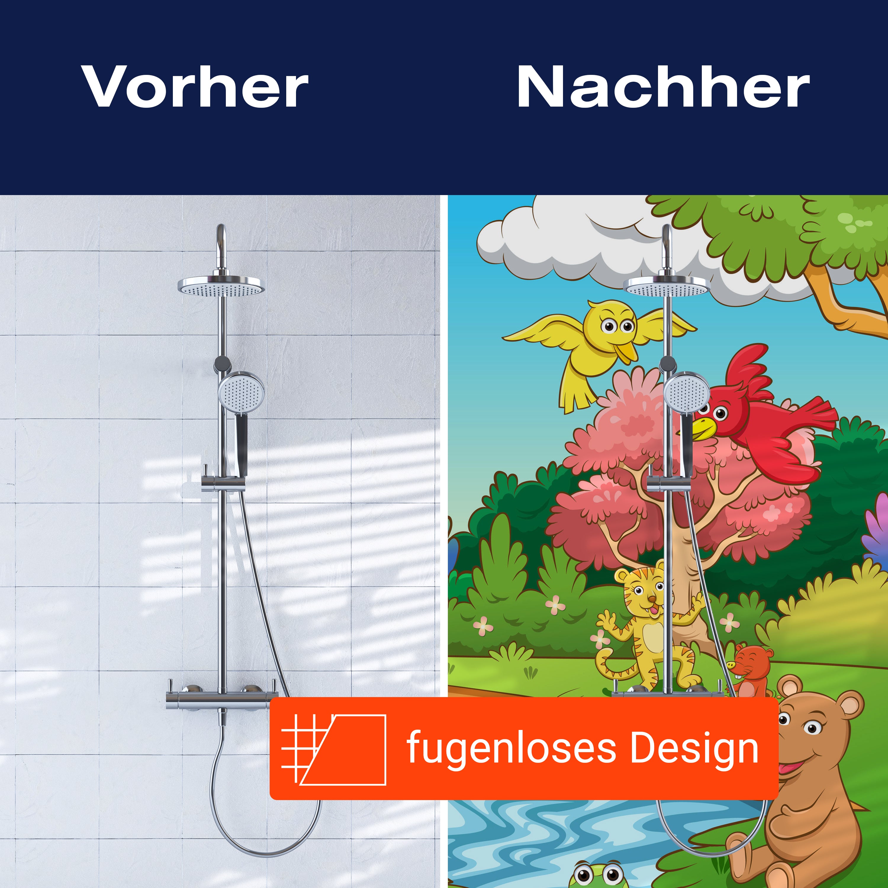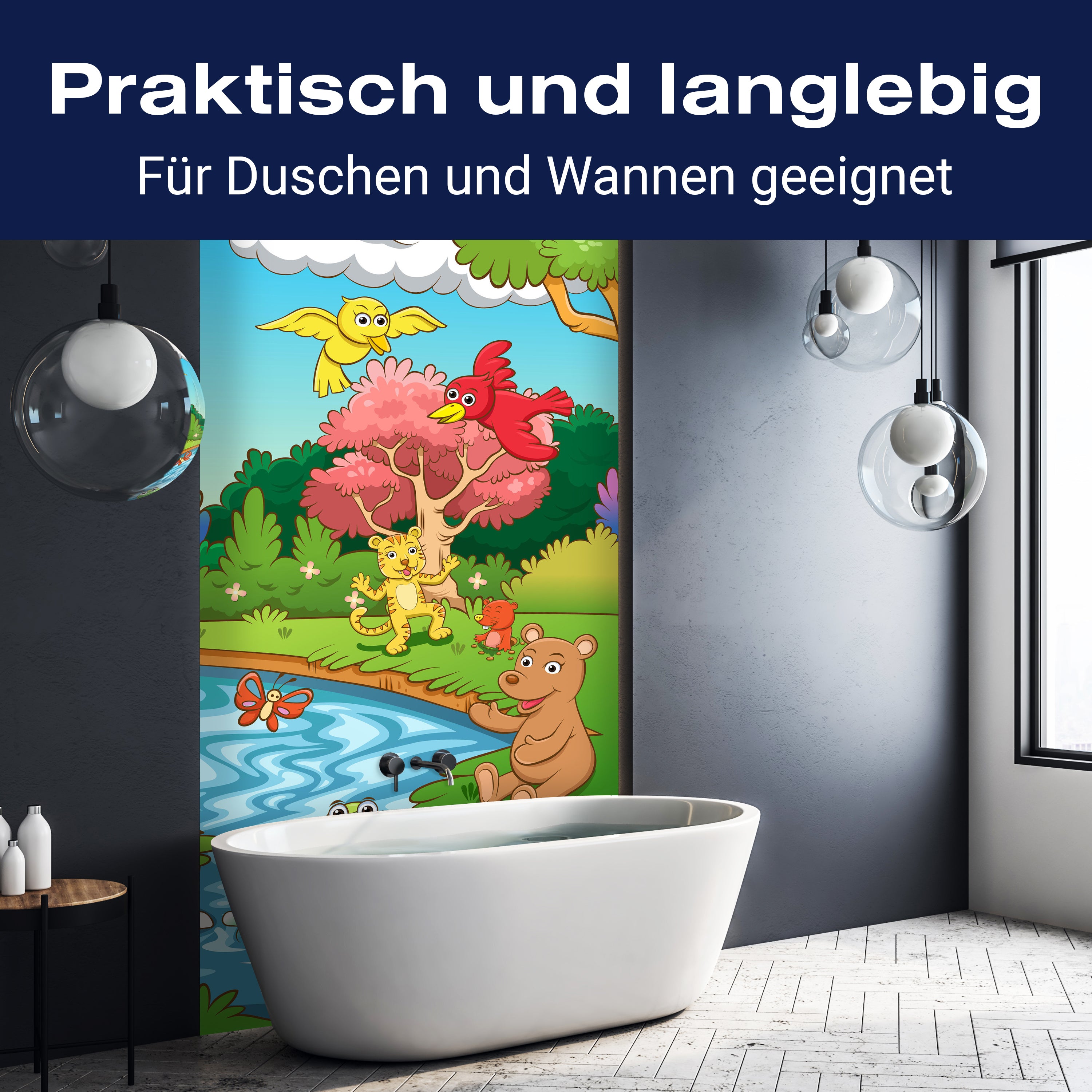 Bist du es leid, auf die langweiligen, schwer zu reinigende Fliesen in deiner Dusche zu schauen? Stell dir vor, wie dein Bad mit einer stilvollen, modernen Rückwand zum Leben erwacht! Unsere Duschwand 'Tiere im Dschungel' ist nicht nur ein optisches Highlight, sondern auch praktisch und pflegeleicht.