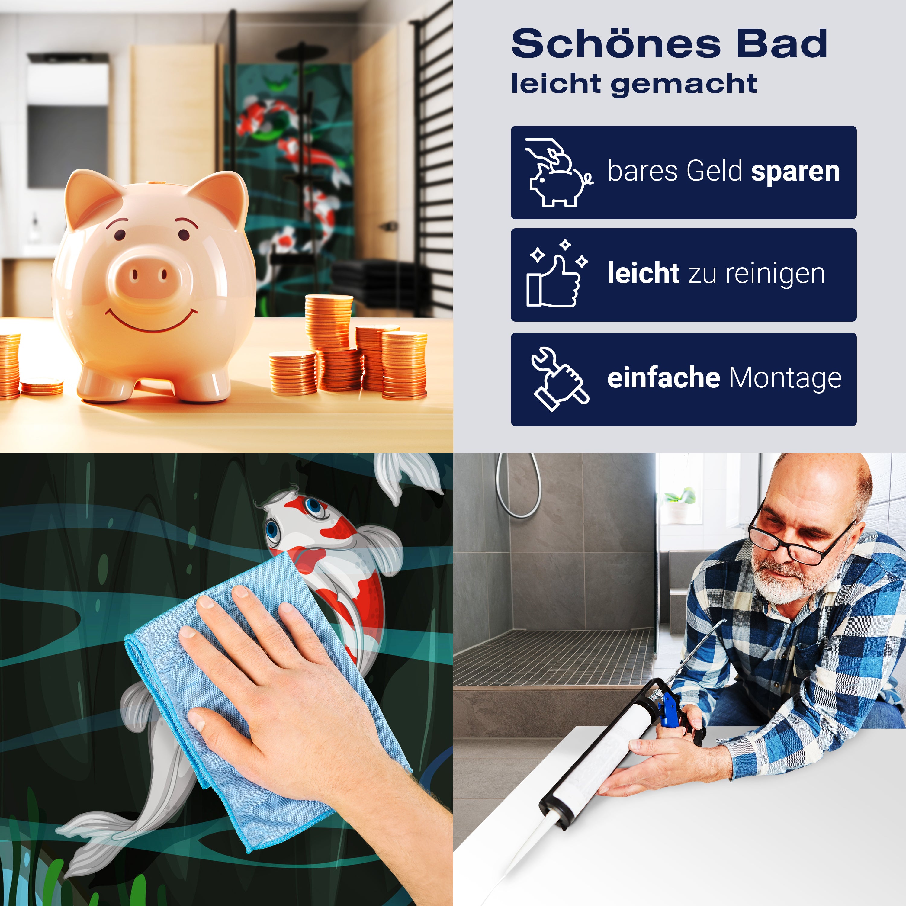 Bist du es leid, auf die langweiligen, schwer zu reinigende Fliesen in deiner Dusche zu schauen? Stell dir vor, wie dein Bad mit einer stilvollen, modernen Rückwand zum Leben erwacht! Unsere Duschwand 'Vier Fische schwimmen im Teich' ist nicht nur ein optisches Highlight, sondern auch praktisch und pflegeleicht.