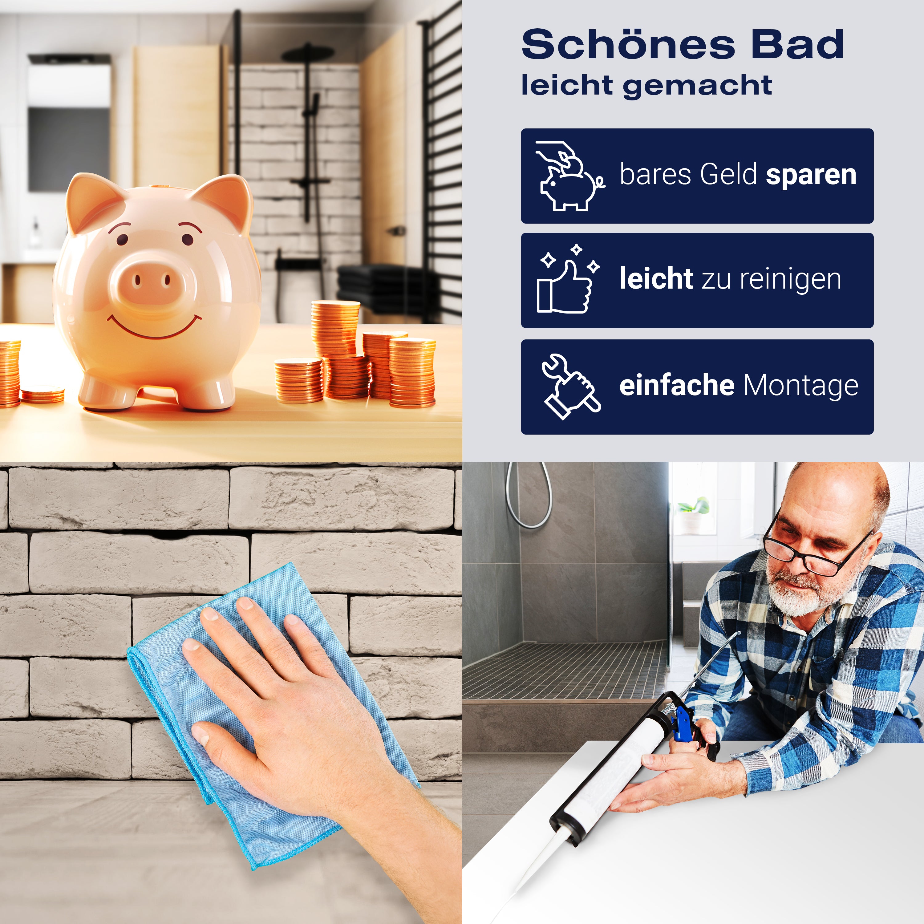 Diese Materialien bieten im Vergleich zu traditionellen Fliesen mehrere Vorteile. Sie haben eine fugenlose Oberfläche, was bedeutet, dass sie weniger anfällig für Schimmelbildung und leichter zu reinigen sind, da sich Schmutz und Kalk nicht in Fugen festsetzen können. Darüber hinaus ermöglichen sie eine schnelle und einfache Renovierung, da sie direkt über bestehenden Fliesen montiert werden können, was Zeit und Kosten spart