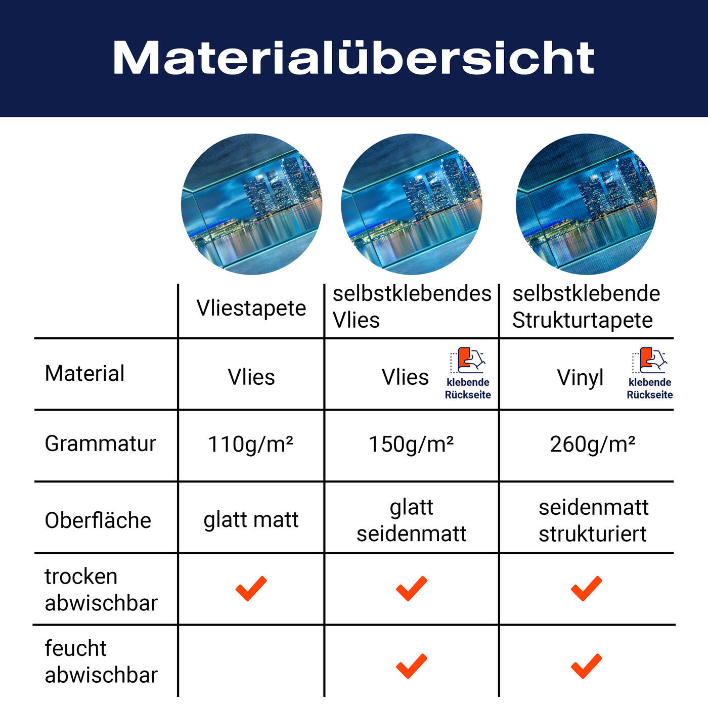 Die Fototapeten sind pflegeleicht und können mit einem feuchten Tuch gereinigt werden, ohne die Farbbrillanz zu beeinträchtigen.