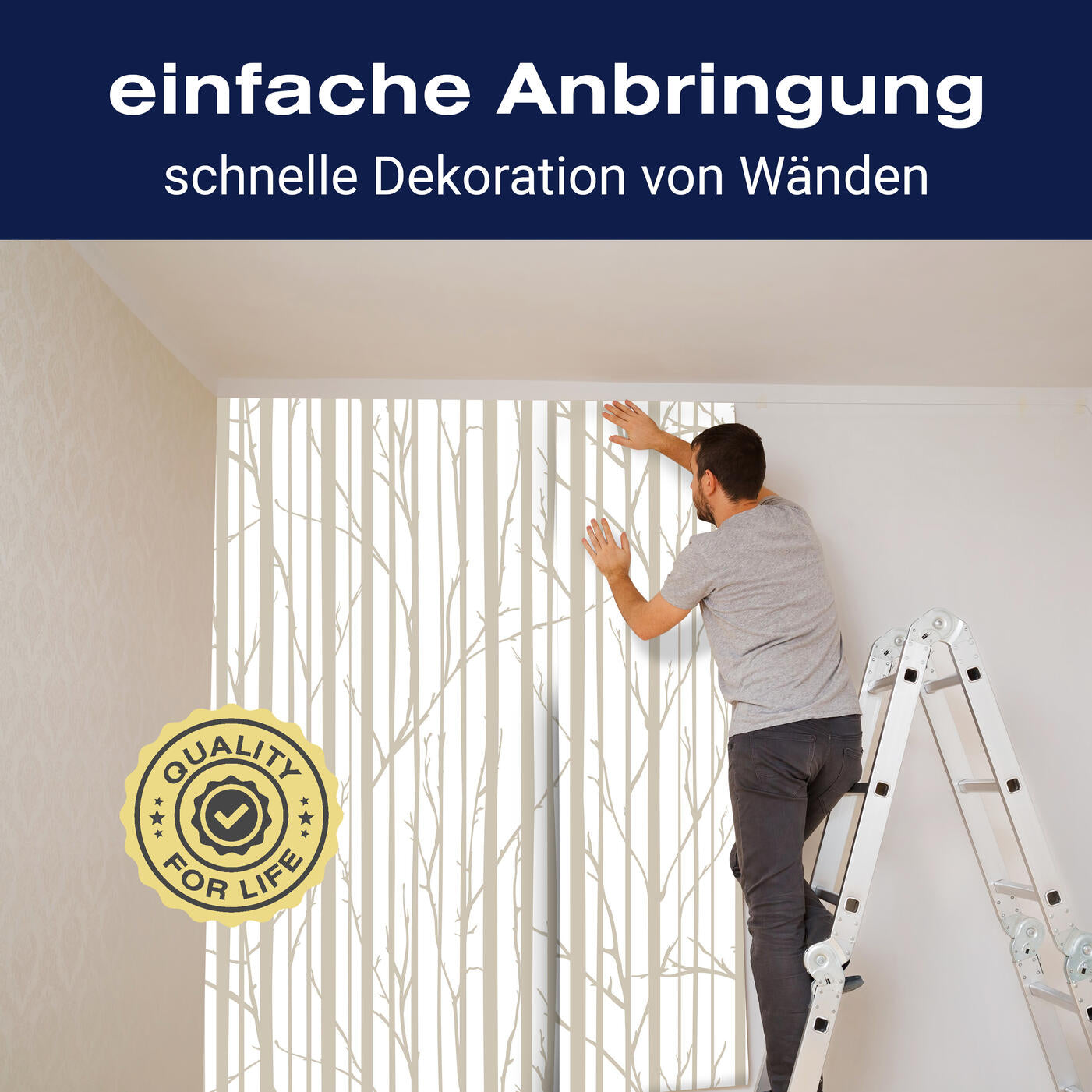 - Wenn deine Fototapete aus mehreren Bahnen besteht, achte darauf, dass die Motive oder das Design sauber und nahtlos ineinander übergehen. Achte dabei auf die Anweisungen des Herstellers oder auf eventuelle Markierungen auf der Tapete selbst.