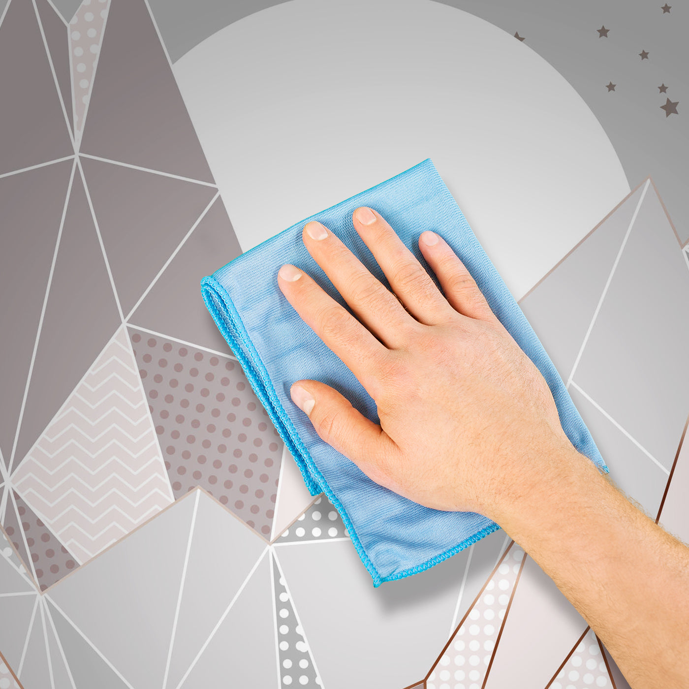 - Reinige eventuelle Verschmutzungen oder Kleberreste sofort mit einem feuchten Schwamm oder Tuch.