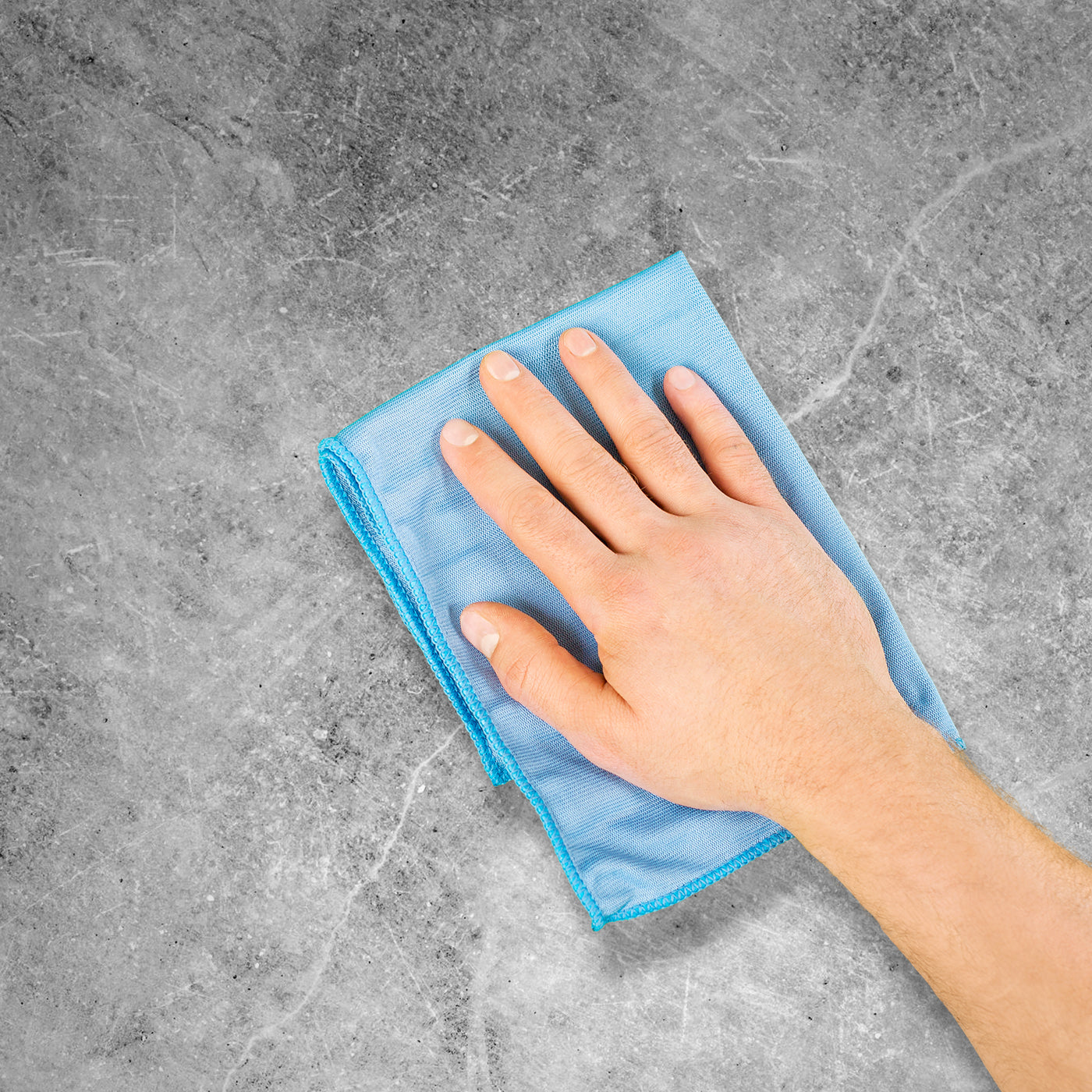 - Reinige eventuelle Verschmutzungen oder Kleberreste sofort mit einem feuchten Schwamm oder Tuch.